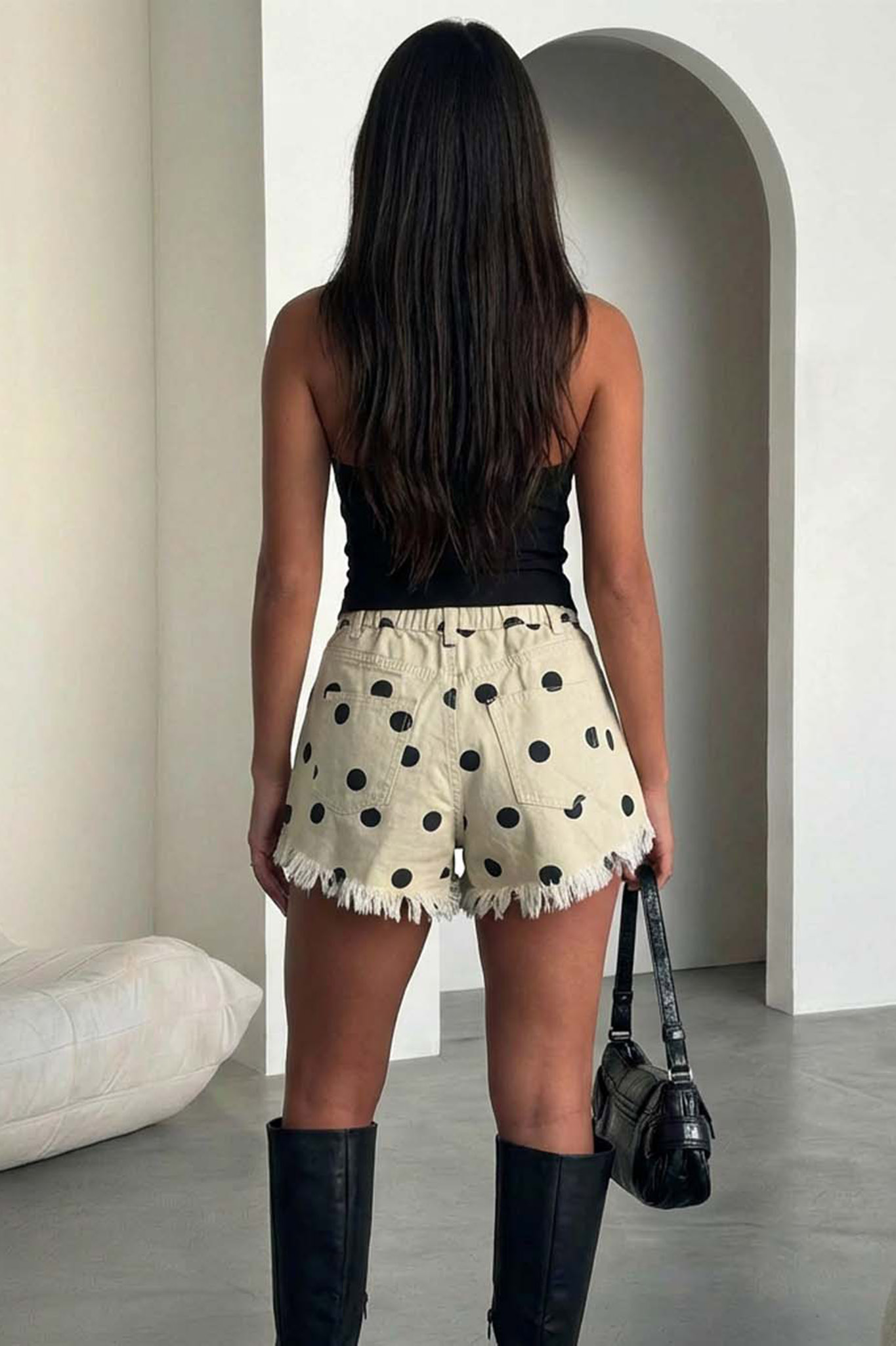 Ψηλόμεσο τζιν σορτς χαρακτηρίζεται από το έντονο πουά μοτίβο και τη μοντέρνα αισθητική του. Είναι κατασκευασμένο από σταθερό denim ύφασμα και διαθέτει φαρδιά μπατζάκια σε γραμμή Α που προσφέρουν άνεση και στυλ.Τα πλούσια ξέφτια στο τελείωμα, του δίνουν έναν ανεπιμέλητο, vintage χαρακτήρα. Το σχέδιο περιλαμβάνει κλασικές τσέπες, θηλιές για ζώνη και κλείσιμο με κουμπί και φερμουάρ, ενώ η γραμμή του αναδεικνύει τη μέση και τα πόδια.