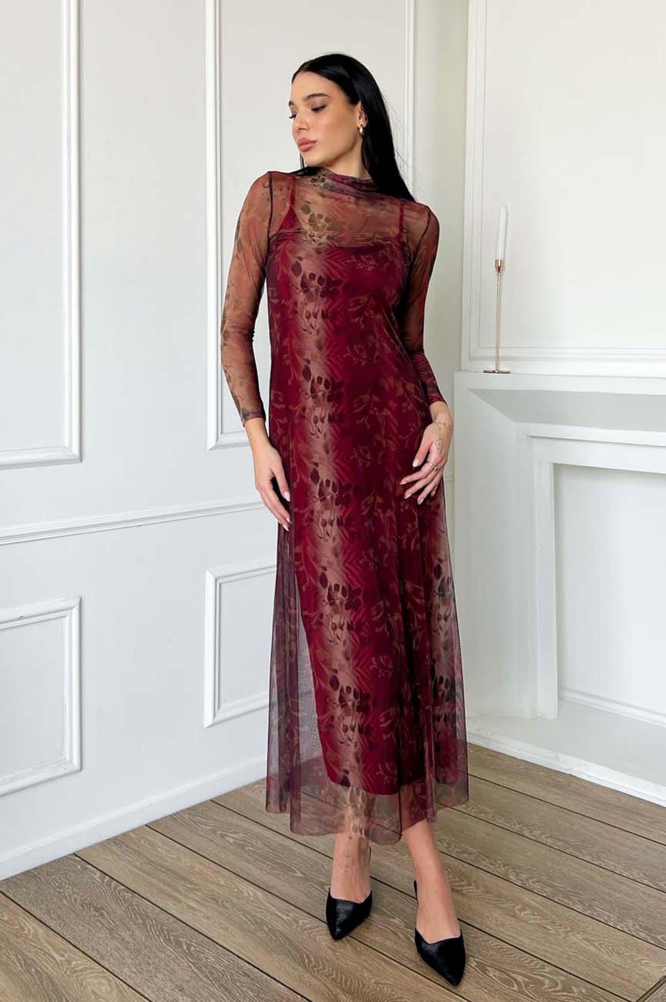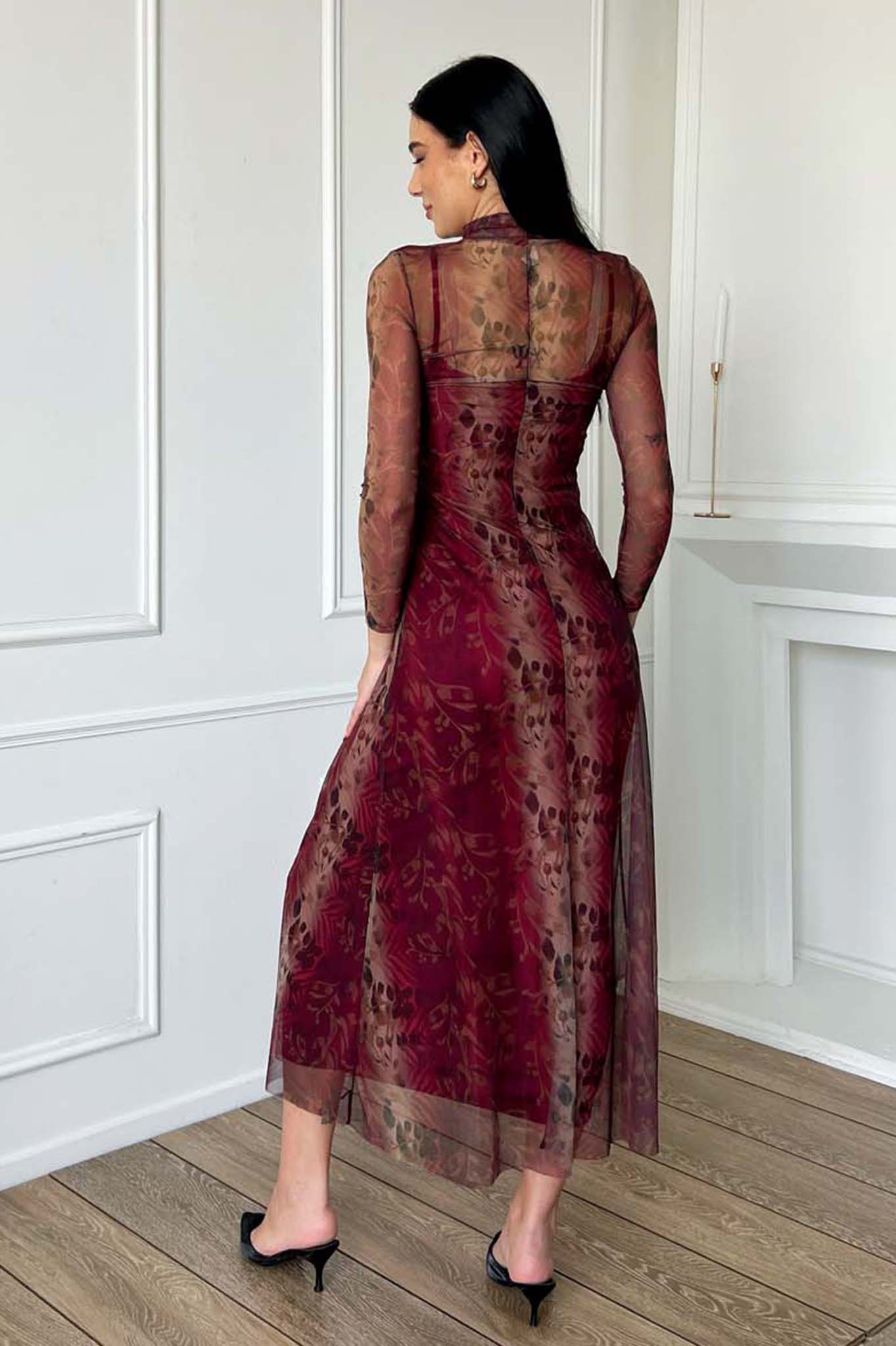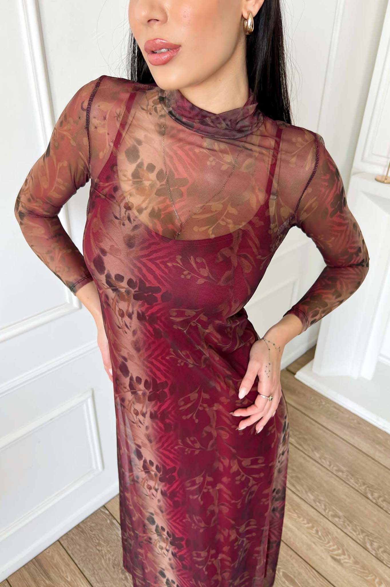Μίντι φόρεμα εμπριμέ με διαφάνεια. Εφαρμοστό που αγκαλιάζει αρμονικά το σώμα. Μήκος 145cm, στήθος 40cm, μανίκι 60cm 1 πετρολ, 4 μπορντό, 1 καφέ, 1 πράσινο