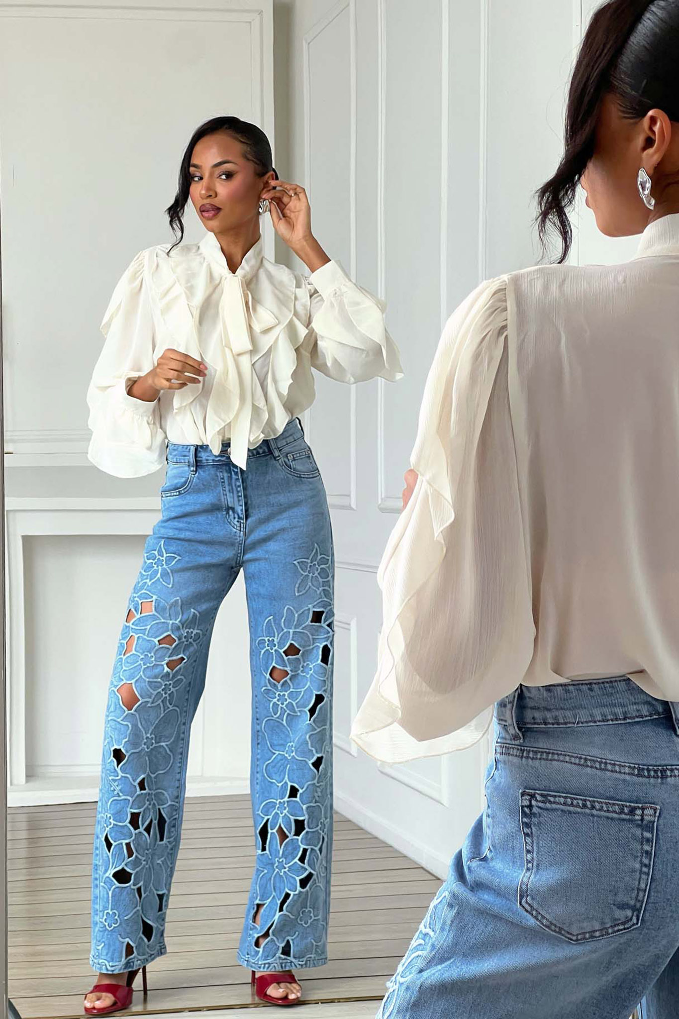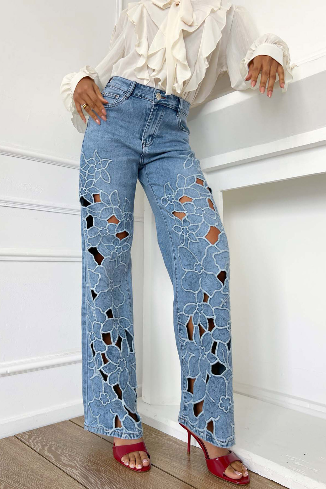 Ψηλόμεσο Wide-Leg Τζιν με Cut-Out Λουλούδια & Κεντημένες Λεπτομέρειες