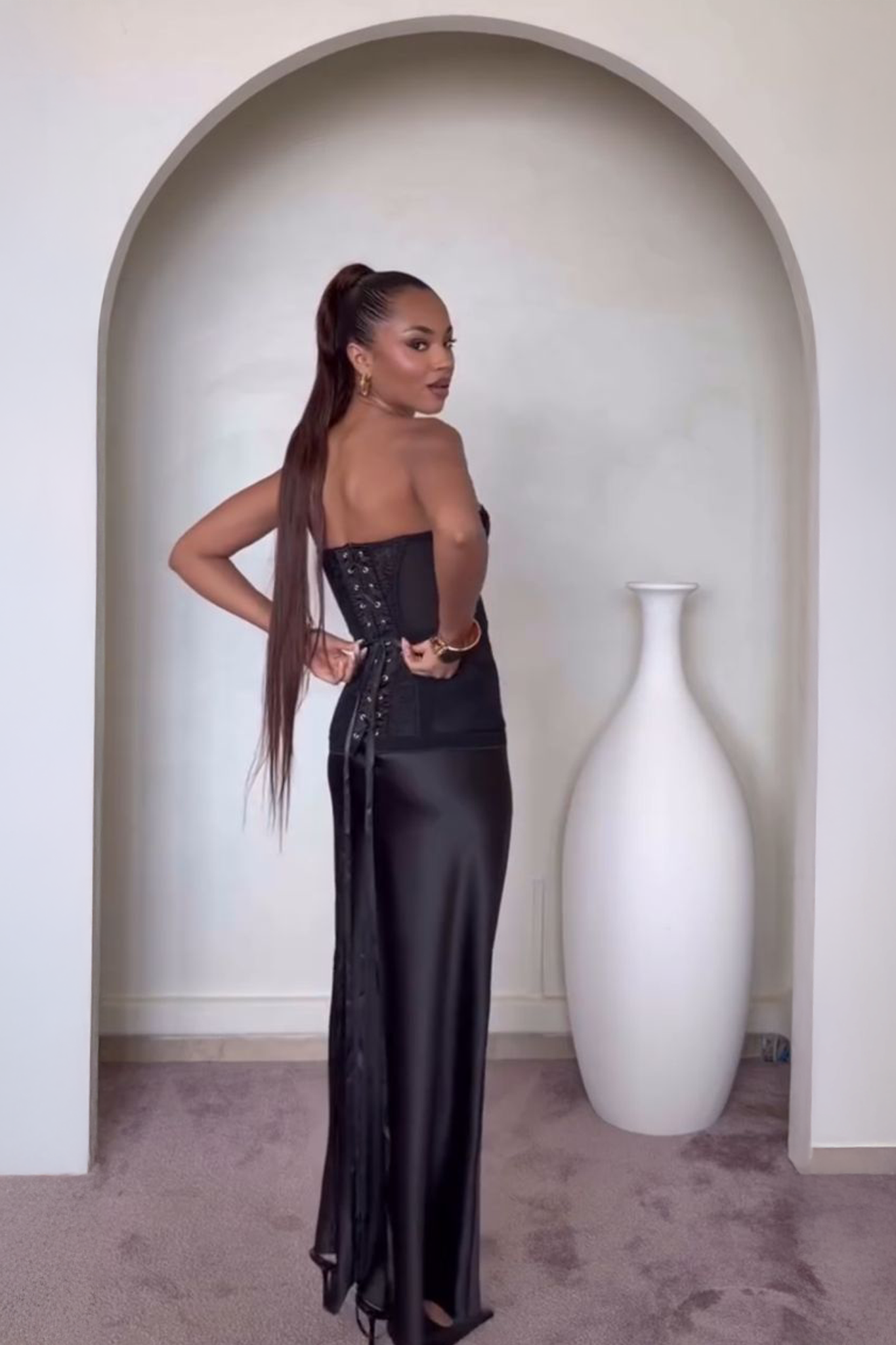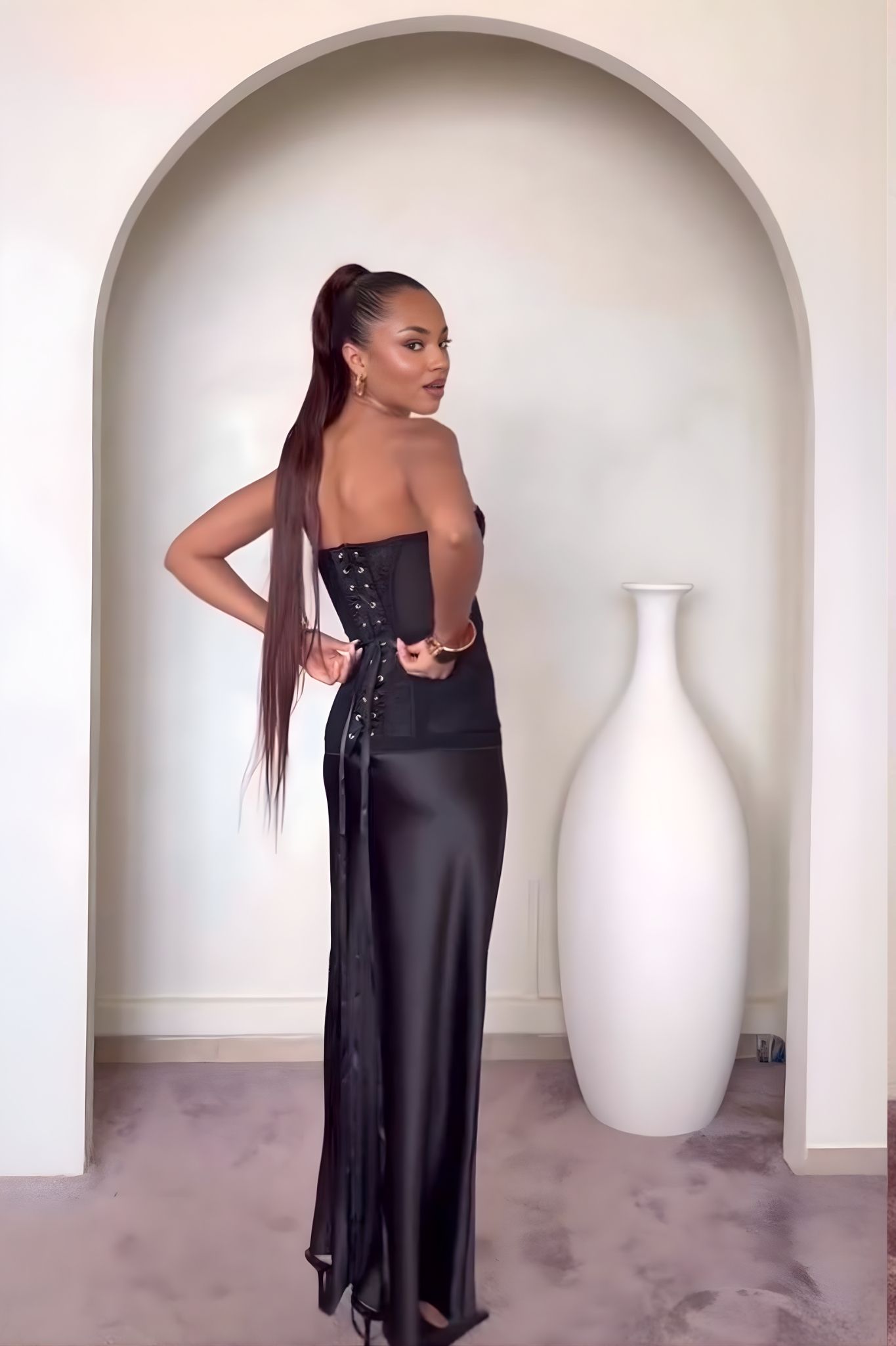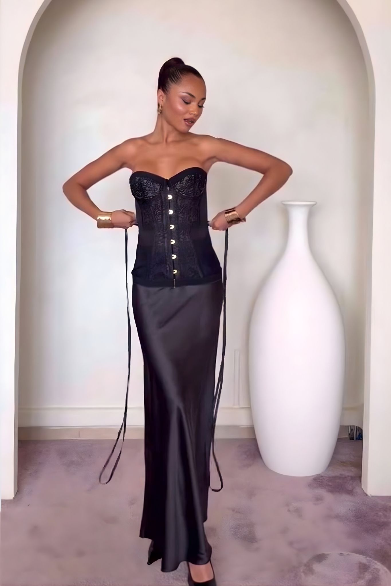 Σετ με κορσέ και σατέν maxi φούστα που δημιουργεί εντυπωσιακή θηλυκή σιλουέτα. Ο εφαρμοστός κορσές συνδυάζεται με σατέν φούστα σε κομψή γραμμή για elegant βραδινές εμφανίσεις.