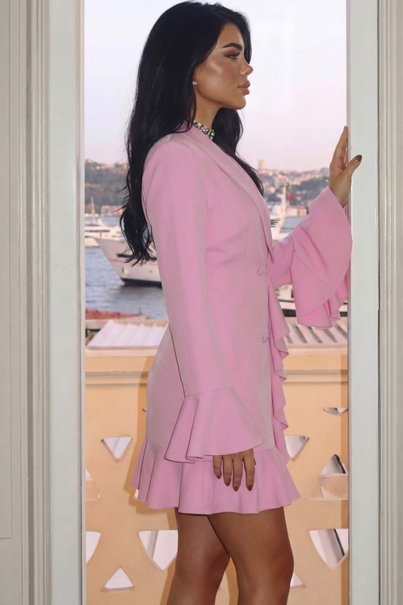Μίνι φόρεμα κρουαζέ με βολάν στο τελείωμα και στα μανίκια. Διαθέτει κουμπιά μπροστά για να αγκαλιάζει καλύτερα τη σιλουέτα.
