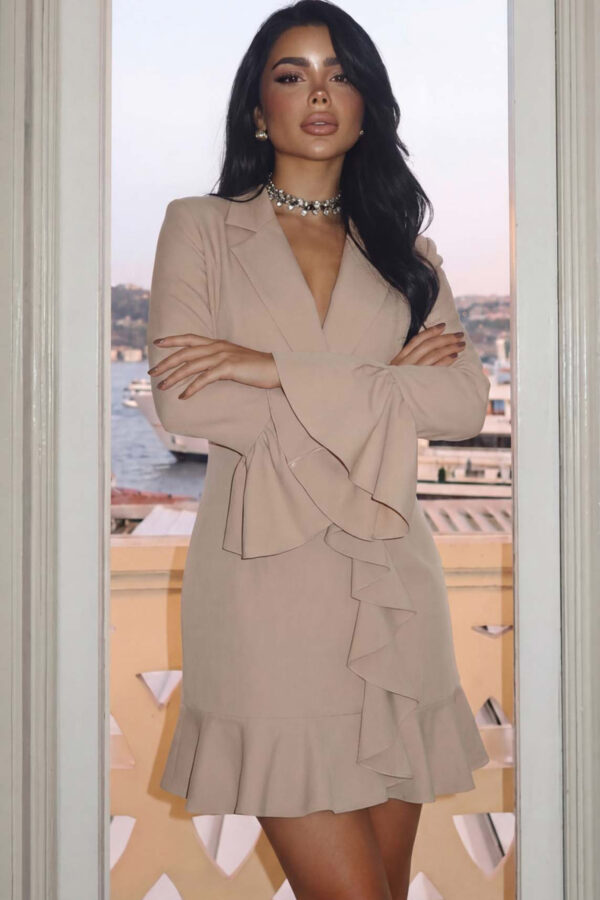 Μίνι φόρεμα κρουαζέ με βολάν στο τελείωμα και στα μανίκια. Διαθέτει κουμπιά μπροστά για να αγκαλιάζει καλύτερα τη σιλουέτα.