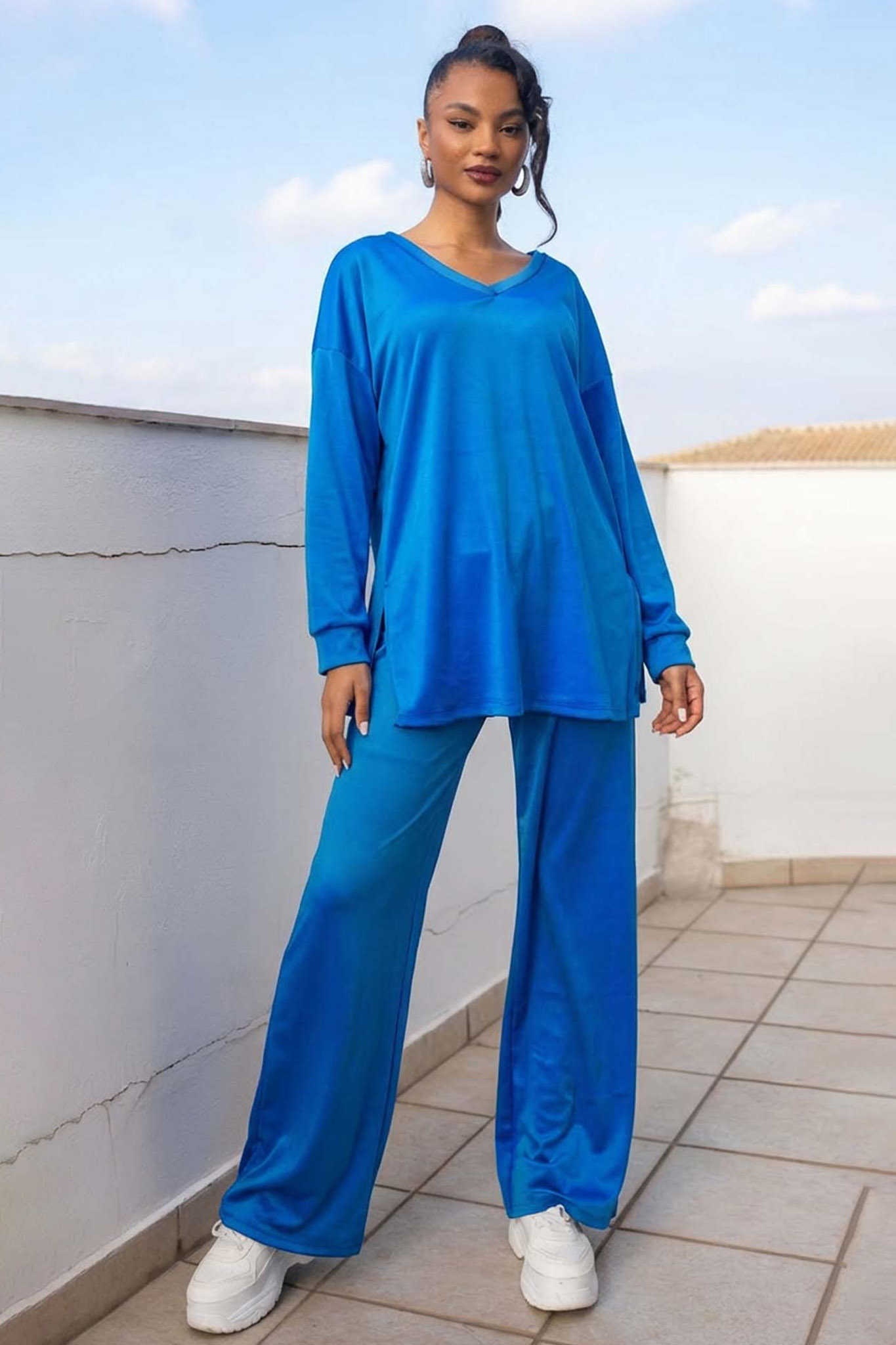 Βελούδινο σετ. Μπλούζα με μακριά μανίκια και V ντεκολτέ. Παντελόνι σε ίσια γραμμή με λάστιχο στη μέση. Mπλούζα 71cm Στήθος 59cm Πλάτη 64cm Μανίκι 47cm Παντελόνι 101cm Μέση 33cm