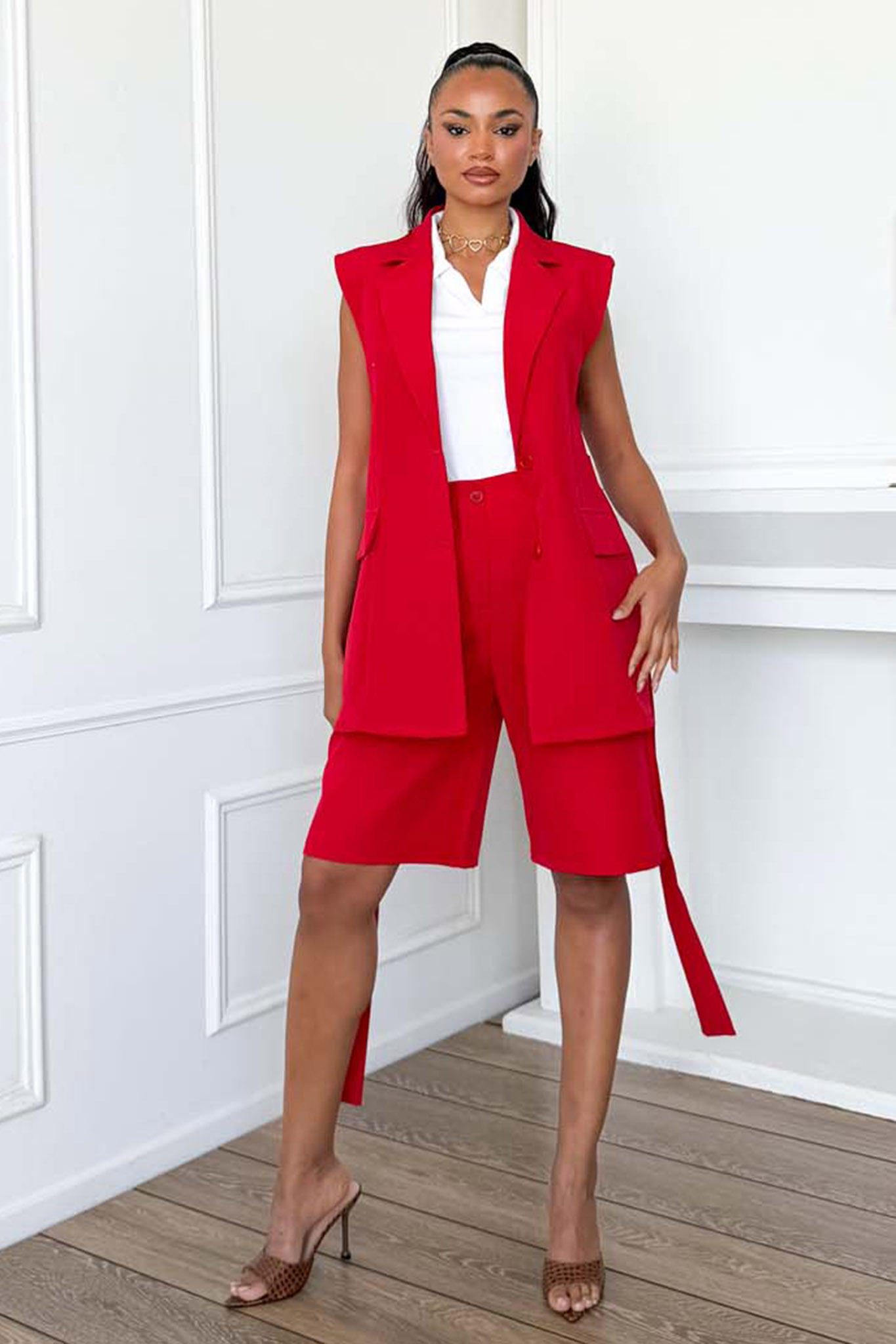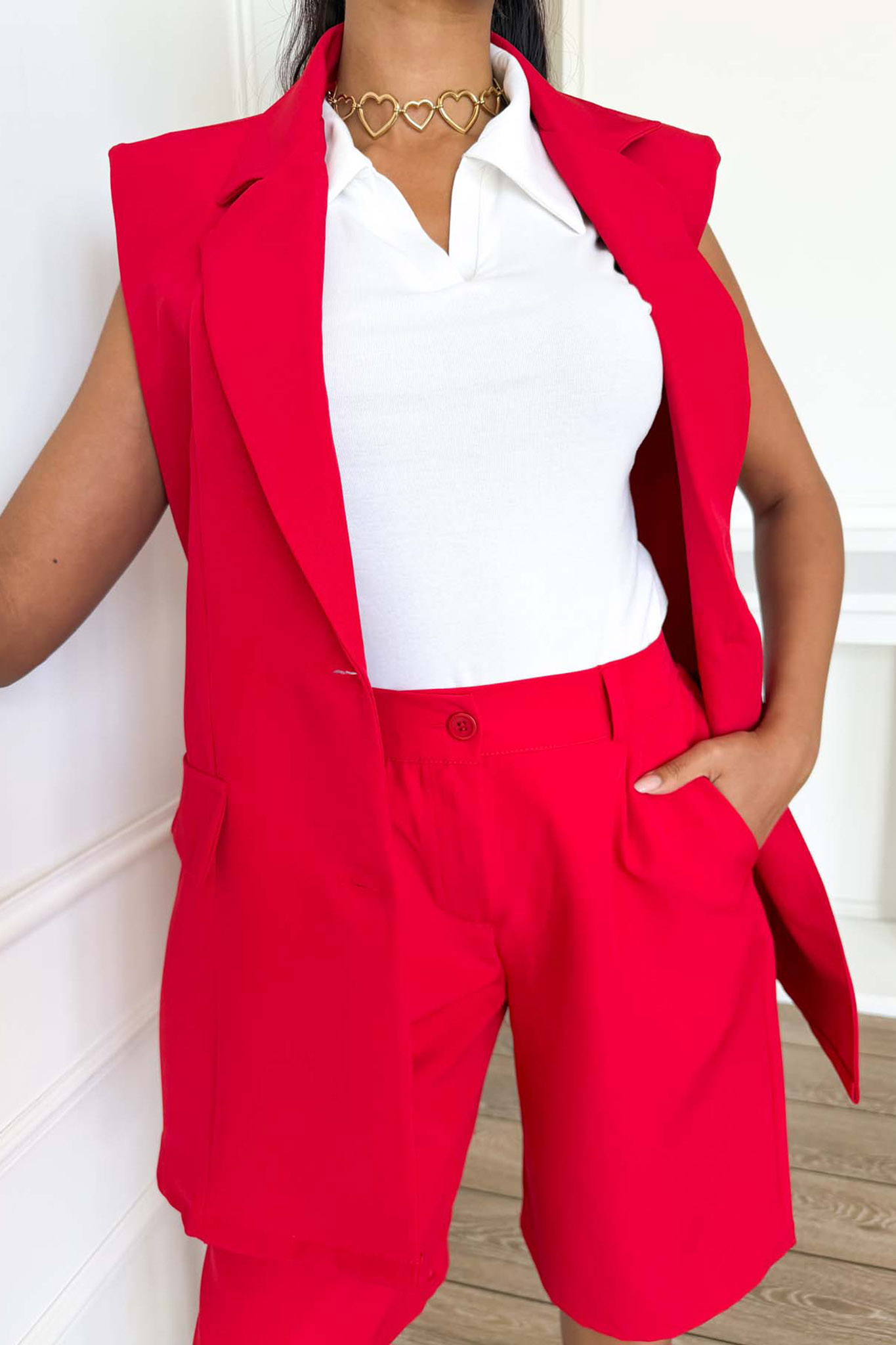 Nueraσετ γιλέκο βερμούδα με ζώνη κόκκινο