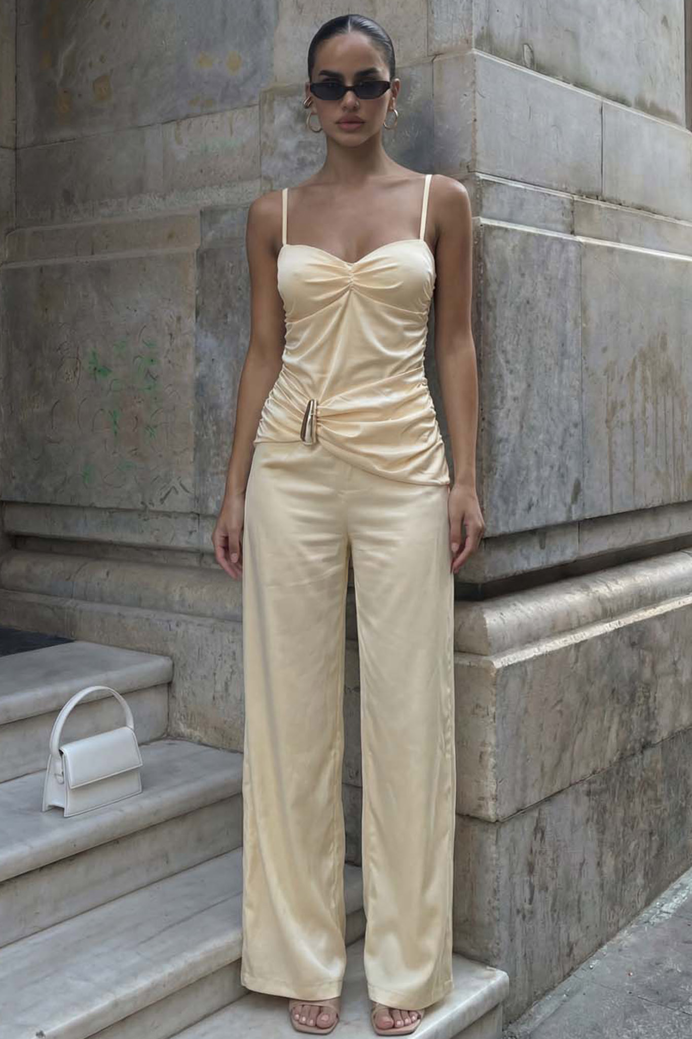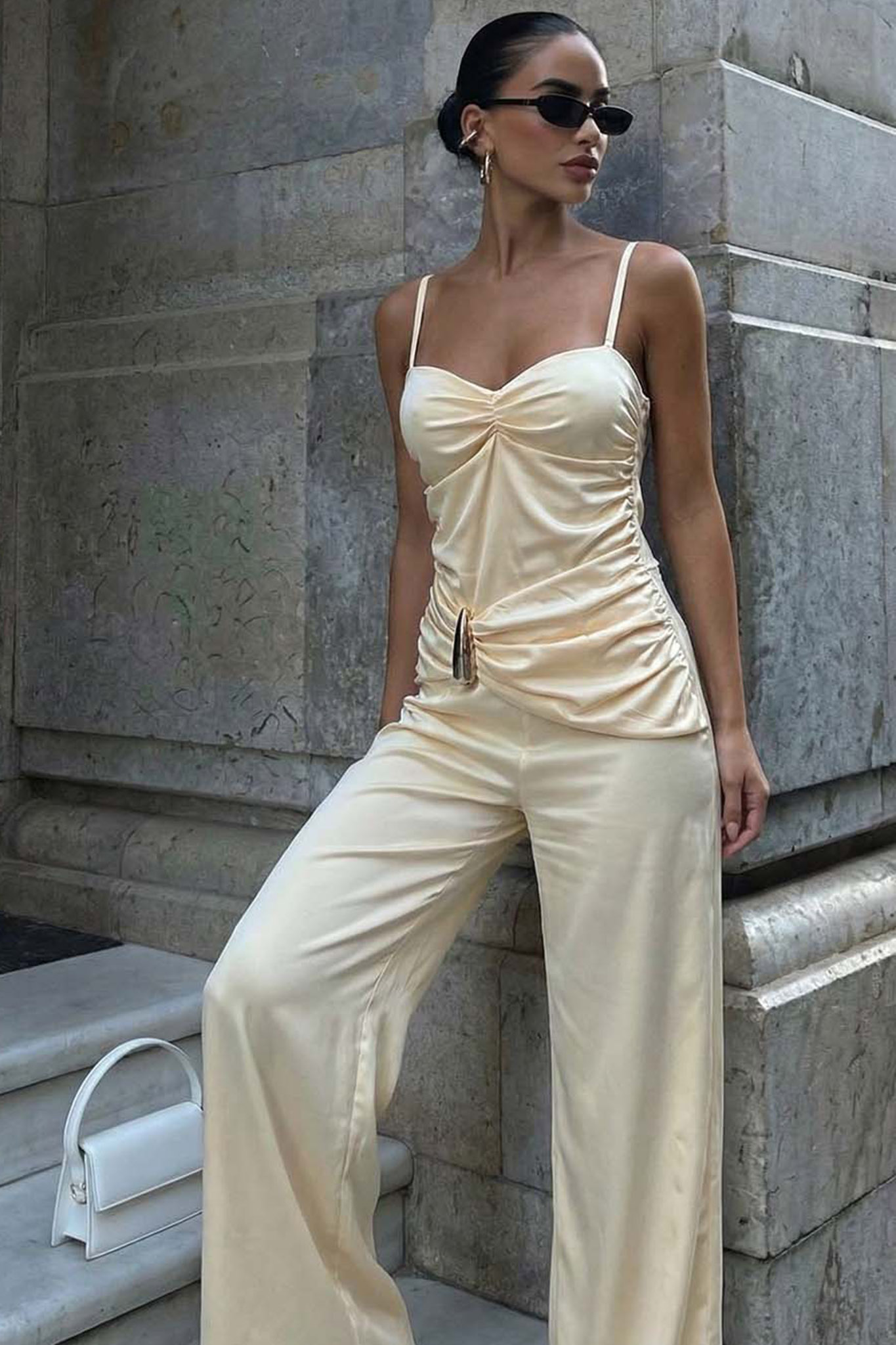 Ολόσωμη φόρμα με τιράντες. Σχεδιασμένη για να κολακεύει τη σιλουέτα, διαθέτει ντραπέ μπούστο με λεπτές τιράντες και περίτεχνες σούρες (ruching) στη μέση που καταλήγουν σε μια κομψή μεταλλική αγκράφα.
