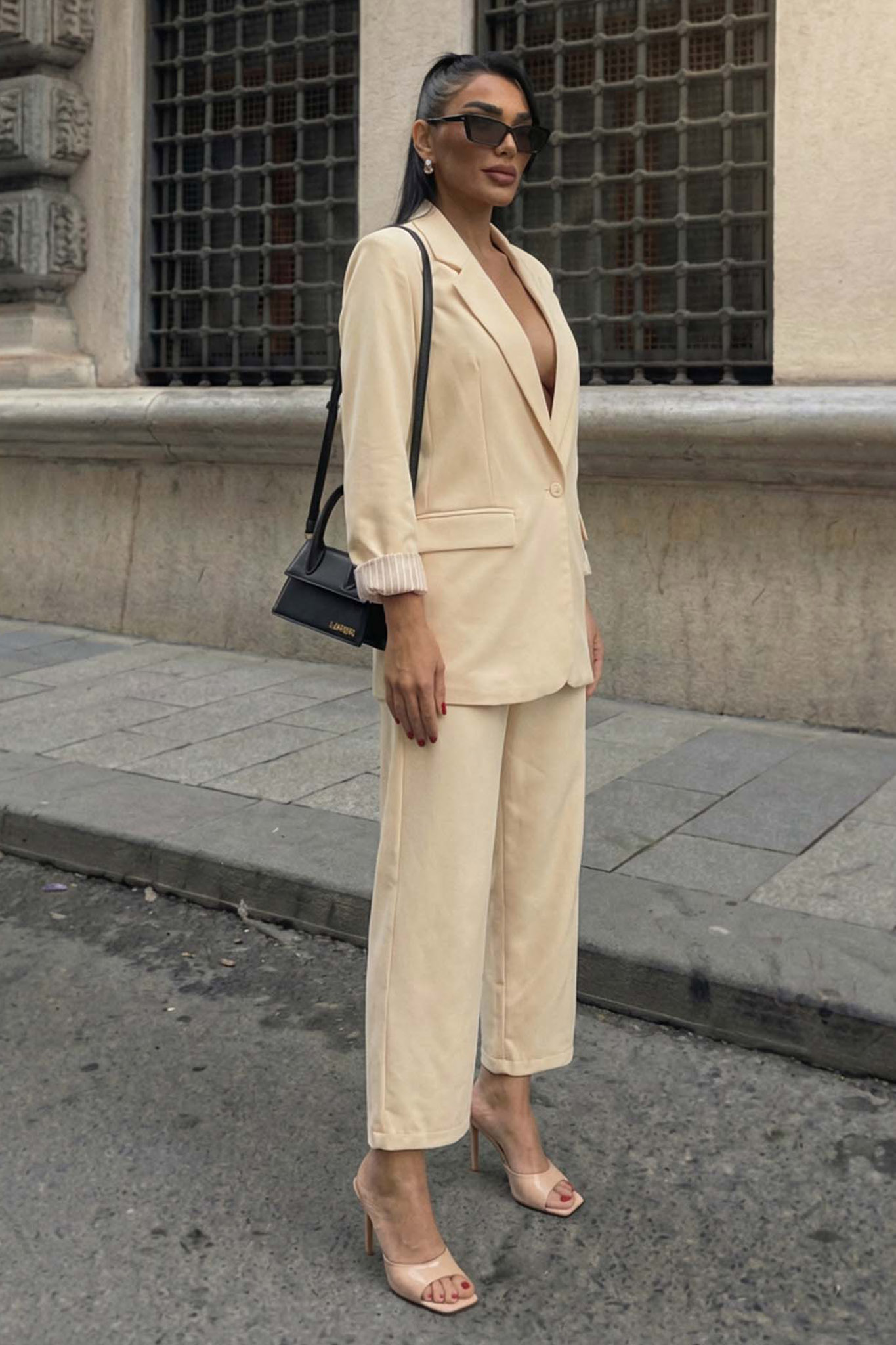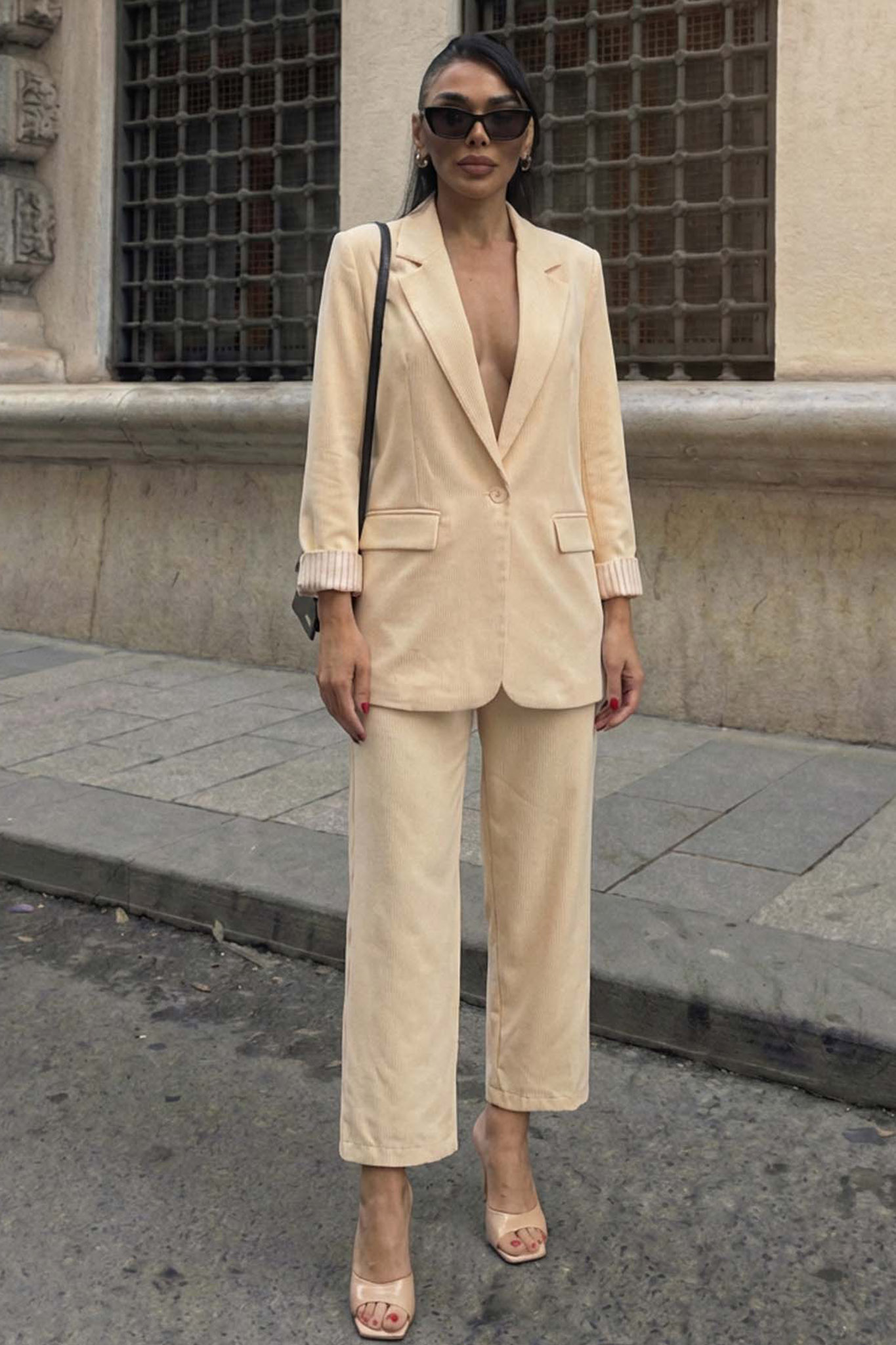 Κλασικό γυναικείο κουστούμι σε oversized γραμμή. Αποτελείται από σακάκι με πέτο και μονό κουμπί και παντελόνα σε ίσια γραμμή.