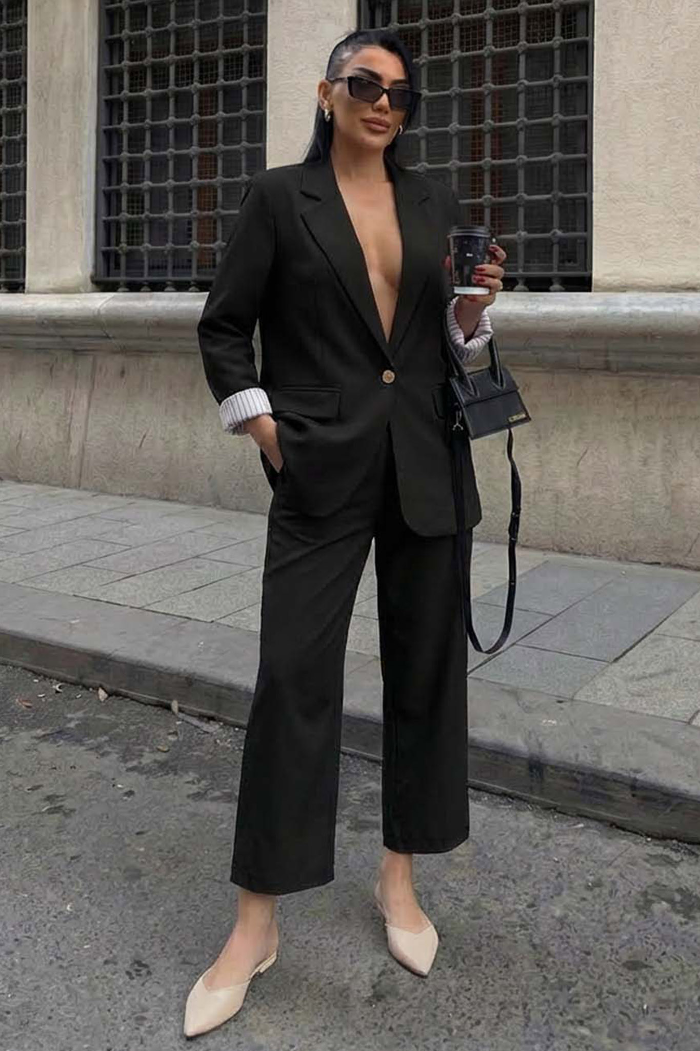 Κλασικό γυναικείο κουστούμι σε oversized γραμμή. Αποτελείται από σακάκι με πέτο και μονό κουμπί και παντελόνα σε ίσια γραμμή.