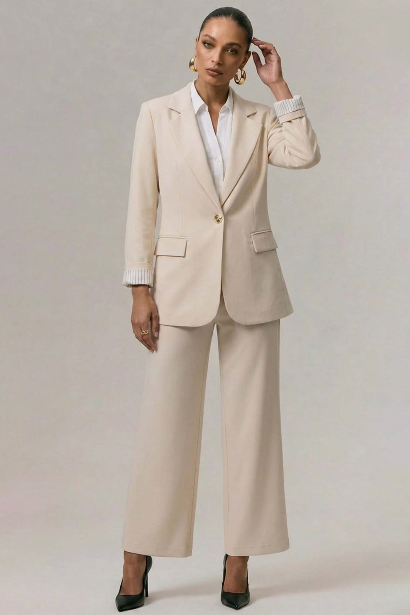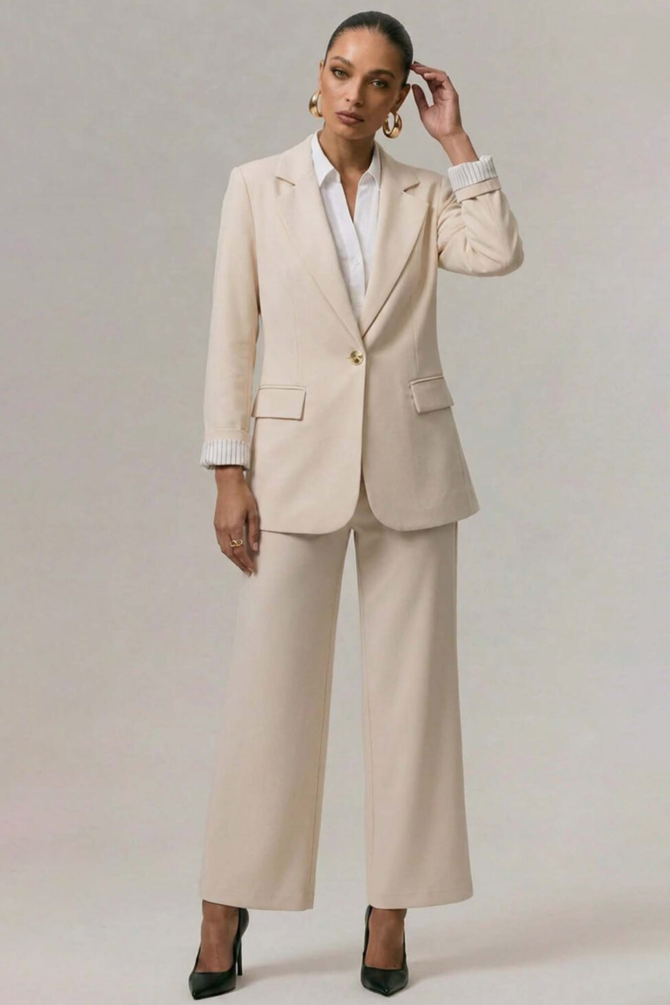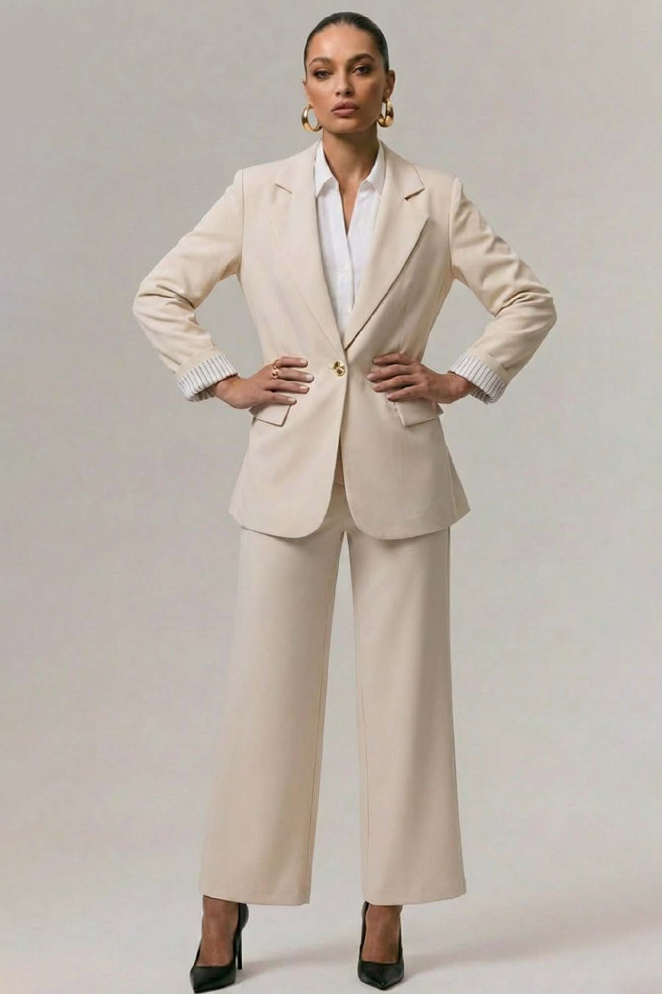 Κλασικό γυναικείο κουστούμι σε oversized γραμμή. Αποτελείται από σακάκι με πέτο και μονό κουμπί και παντελόνα σε ίσια γραμμή. To παντελόνι διαθέτει κουμπί και φερμουάρ μπροστά. Σακάκι Μήκος 74cm, στήθος 110cm,μανίκι 55cm. Παντελόνι μήκος 95cm, μέση 70cm.