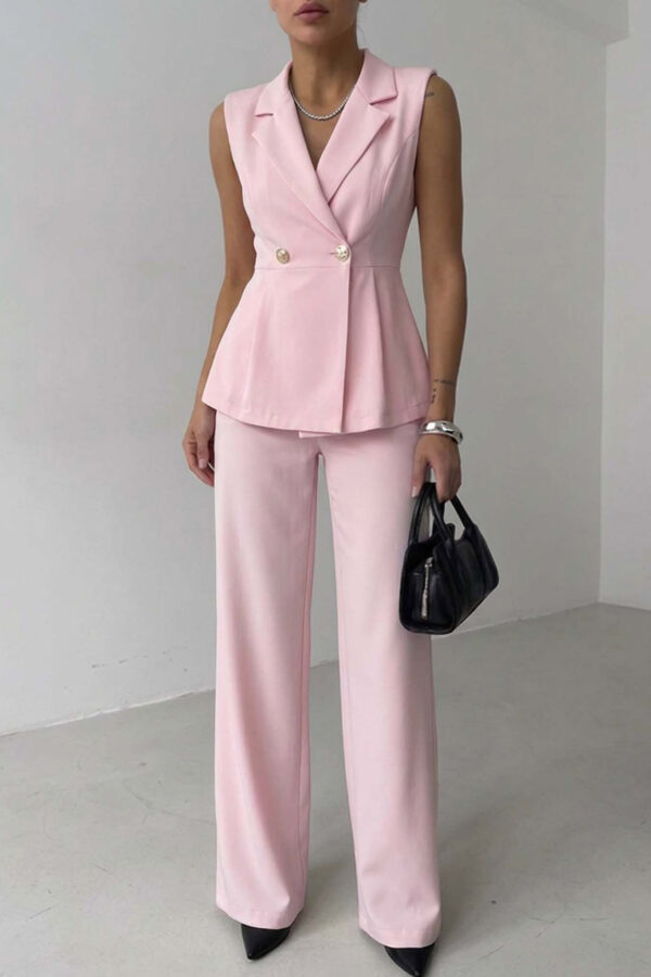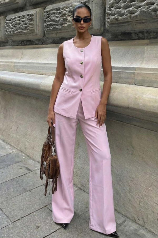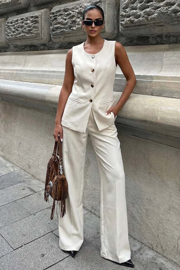 Σετ γιλέκο-παντελόνι. Γιλέκο με σταυρωτό κούμπωμα με πέτο και βάτες. Παντελόνι ψηλόμεσο σε ίσια γραμμή, με τσέπες. Κλείνει με φερμουάρ και κουμπί. Γιλέκο 70cm στήθος 50cm Παντελόνι Μήκος 105cm μέση 37cm