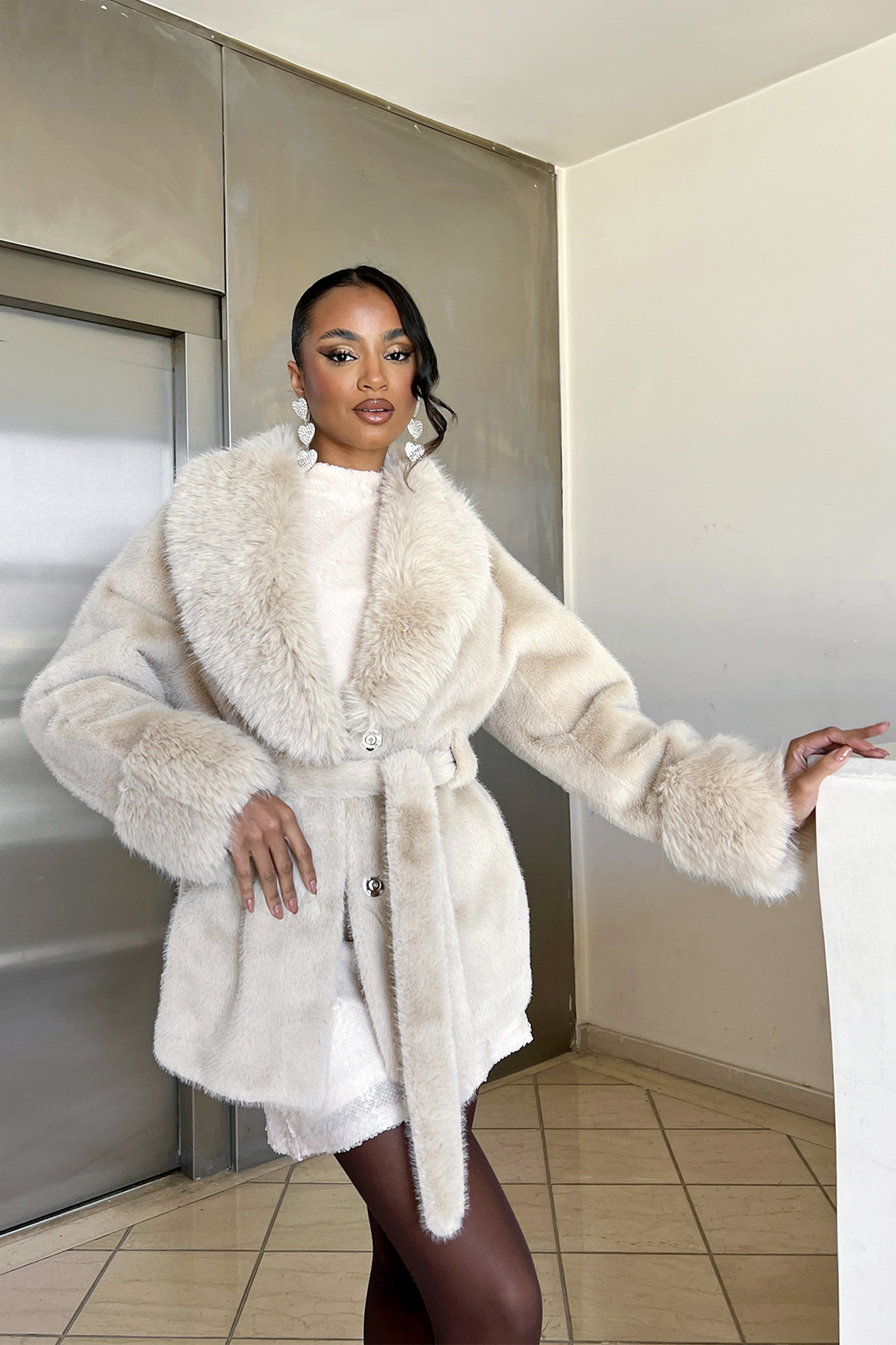 Οικολογική γούνα, μεσαίου μεγέθους με ενσωματωμένη ζώνη στη μέση. Προσφέρει προστασία από το κρύο και στιλ στις εμφανίσεις σας. Ιδανική για όλες τις ώρες της ημέρας. Μήκος 72cm, στήθος 110cm, μανίκι 60cm.
