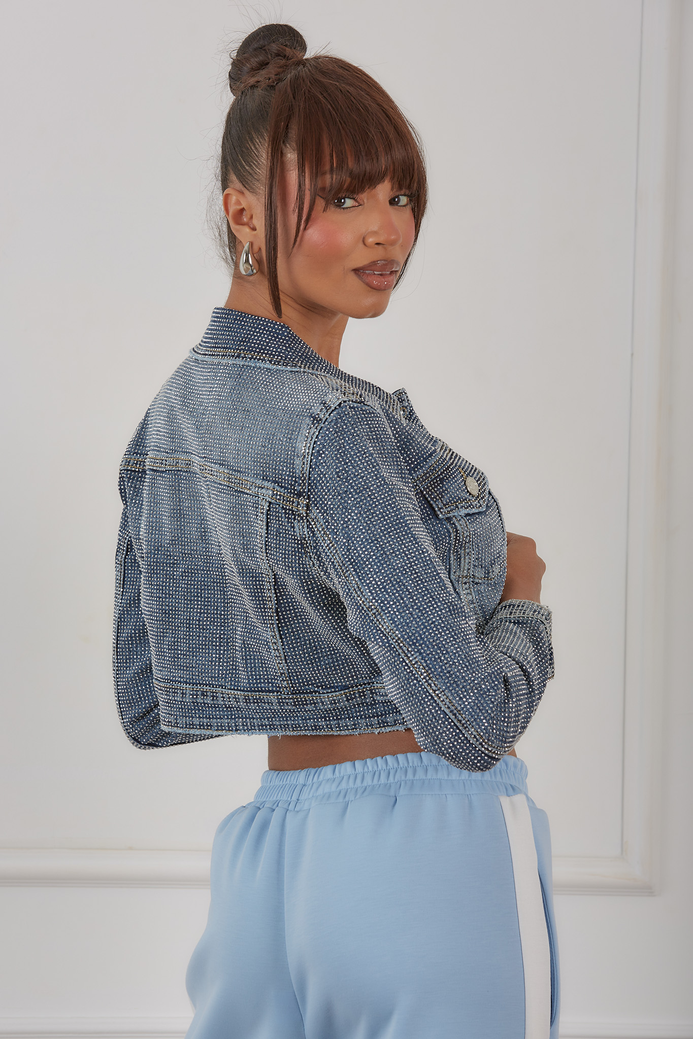 Εντυπωσιακό cropped τζιν τζάκετ, διακοσμημένο με λαμπερά στρας σε όλη την επιφάνεια για μια κομψή και μοντέρνα εμφάνιση. Διαθέτει κλασικό γιακά, κουμπιά μπροστά και δύο τσέπες με καπάκι στο στήθος, προσφέροντας πρακτικότητα και στυλ. Η κοντή του γραμμή