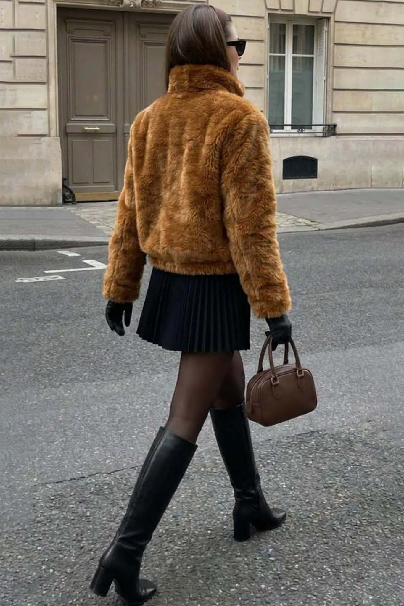 Opalκοντό γουνάκι τύπου bomber με φερμούαρ κάμελ