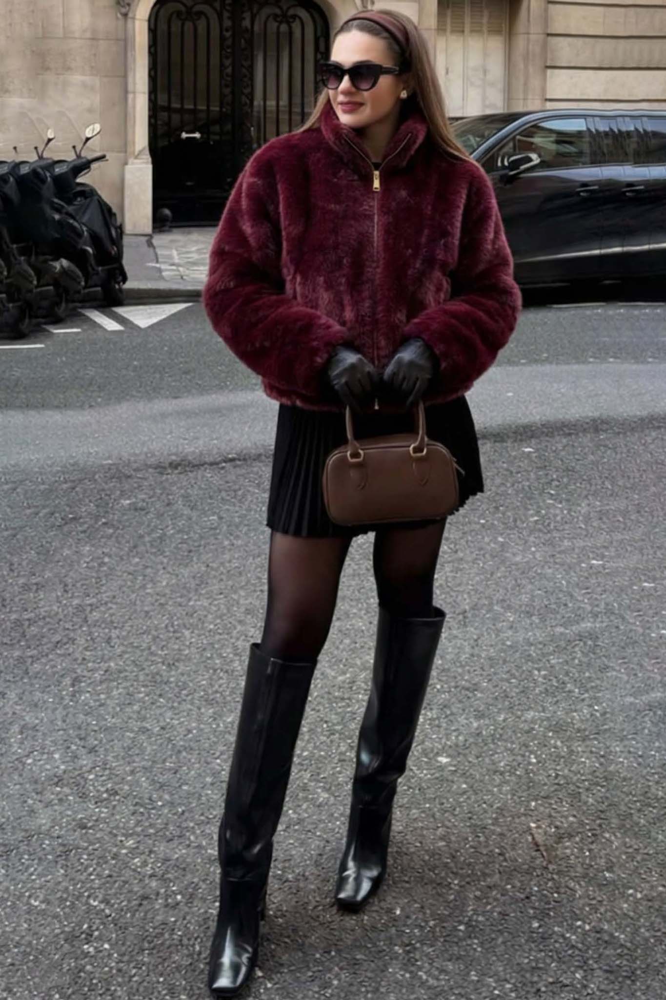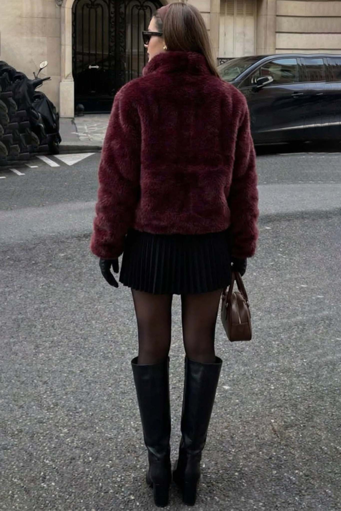 Opalκοντό γουνάκι τύπου bomber με φερμούαρ μπορντό