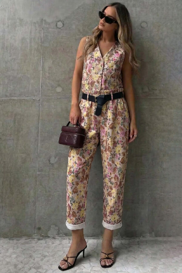 Σετ τοπ-παντελόνι. Στράπλες τοπ με ιδιαίτερο σχέδιο στο μπούστο, διακοσμητικά κουμπάκιια και λάστιχο στη πλάτη. Παντελόνι σψηλόμεσο σε ίσια γραμμή με λάστιχο στη μέση. Toπ Μήκος 42cm στήθος 40cm Παντελόνι Μήκος 111cm μέση 35cm