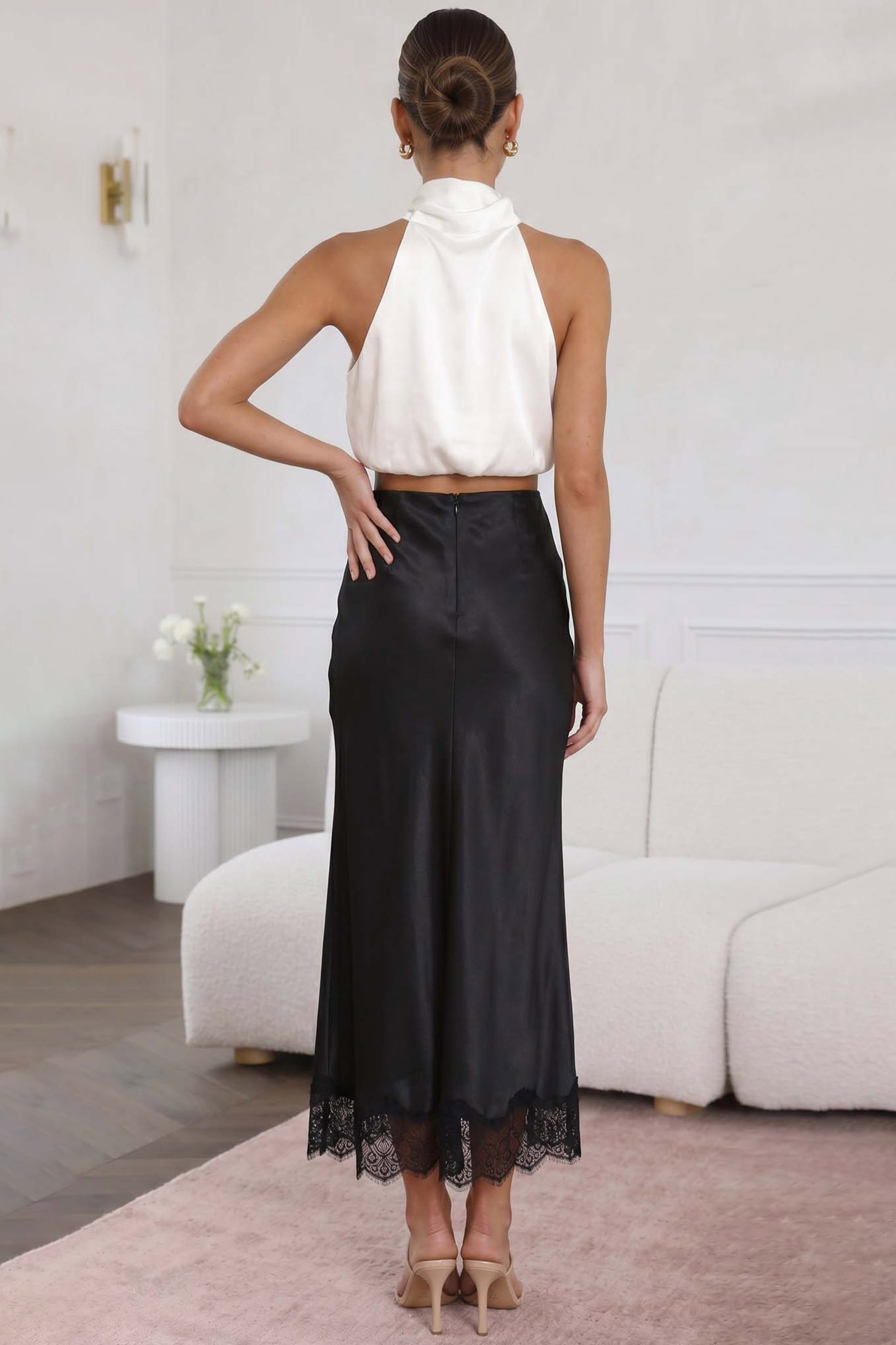 Μίντι φούστα σε γραμμή slip-skirt, η οποία χαρακτηρίζεται από το κομψό τελείωμα με δαντέλα στο κάτω μέρος.Διαθέτει ελαστική μέση για άνετη εφαρμογή, ενώ το ύφασμά της είναι λείο με διακριτική γυαλάδα, προσφέροντας μια θηλυκή και αέρινη αίσθηση που την καθιστά ιδανική τόσο για βραδινές όσο και για προσεγμένες καθημερινές εμφανίσεις. Mήκος 88cm, μέση 70cm.
