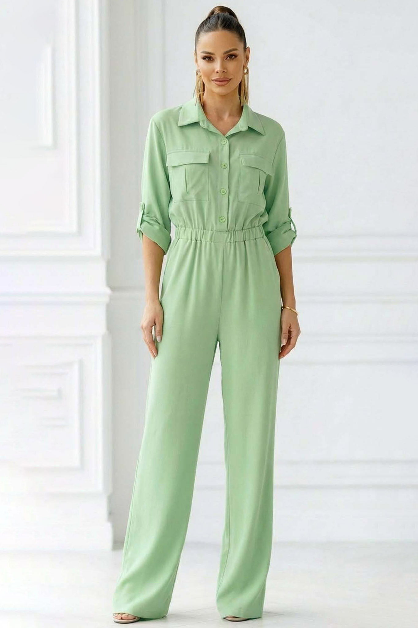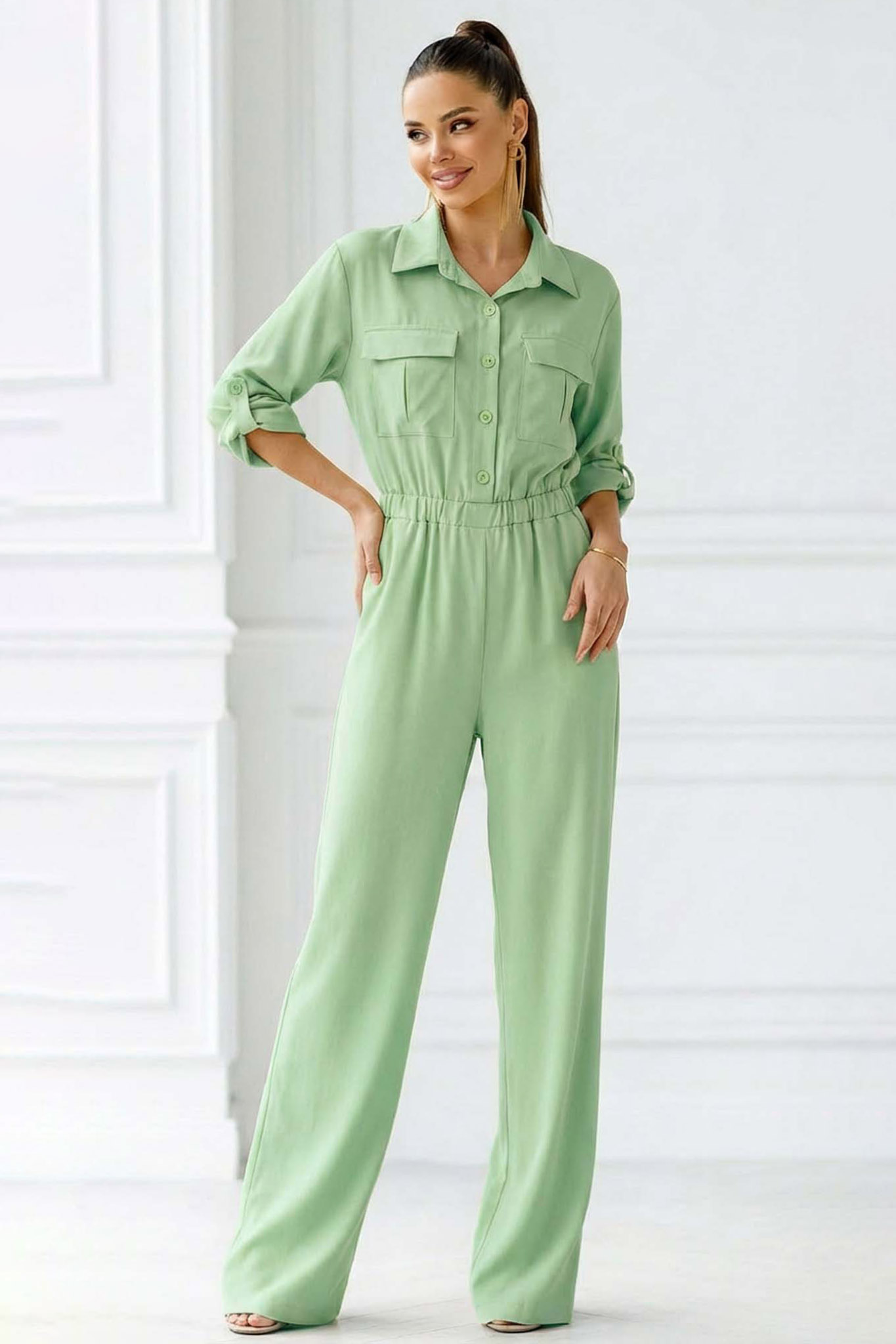 Ολόσωμη φόρμα με σχεδιασμό που θυμίζει πουκάμισο, διαθέτει κλασικό γιακά, κλείσιμο με κουμπιά μπροστά, πρακτικές τσέπες στο στήθος και τα πλαϊνά, και μακριά μανίκια. Το λάστιχο στη μέση εξασφαλίζει τέλεια εφαρμογή και κολακεύει τη σιλουέτα, ενώ η φαρδιά γραμμή του παντελονιού προσφέρει άνεση και κίνηση. Κατασκευασμένη από ανάλαφρο, ρευστό ύφασμα, είναι η ιδανική επιλογή για αβίαστες εμφανίσεις όλη μέρα.