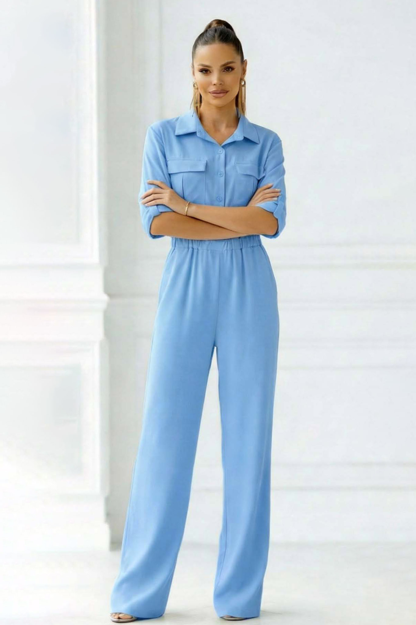 Ολόσωμη φόρμα με σχεδιασμό που θυμίζει πουκάμισο, διαθέτει κλασικό γιακά, κλείσιμο με κουμπιά μπροστά, πρακτικές τσέπες στο στήθος και τα πλαϊνά, και μακριά μανίκια. Το λάστιχο στη μέση εξασφαλίζει τέλεια εφαρμογή και κολακεύει τη σιλουέτα, ενώ η φαρδιά γραμμή του παντελονιού προσφέρει άνεση και κίνηση. Κατασκευασμένη από ανάλαφρο, ρευστό ύφασμα, είναι η ιδανική επιλογή για αβίαστες εμφανίσεις όλη μέρα.