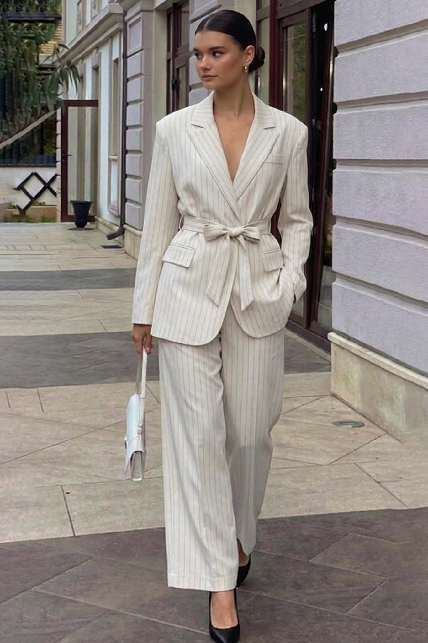 Σετ σακάκι παντελόνι με ρίγες. Το σετ αποτελείται από ένα σακάκι με κλασικό πέτο και τσέπες, το οποίο δένει στη μέση με μια ασορτί υφασμάτινη ζώνη, προσδίδοντας θηλυκότητα και τονίζοντας τη σιλουέτα. Το παντελόνι, σε φαρδιά (wide-leg) ή ίσια γραμμή, ολοκληρώνει το σύνολο με άνεση και φινέτσα. Κατασκευασμένο από ανάλαφρο ύφασμα, είναι η ιδανική επιλογή για εντυπωσιακές, επαγγελματικές ή επίσημες εμφανίσεις.