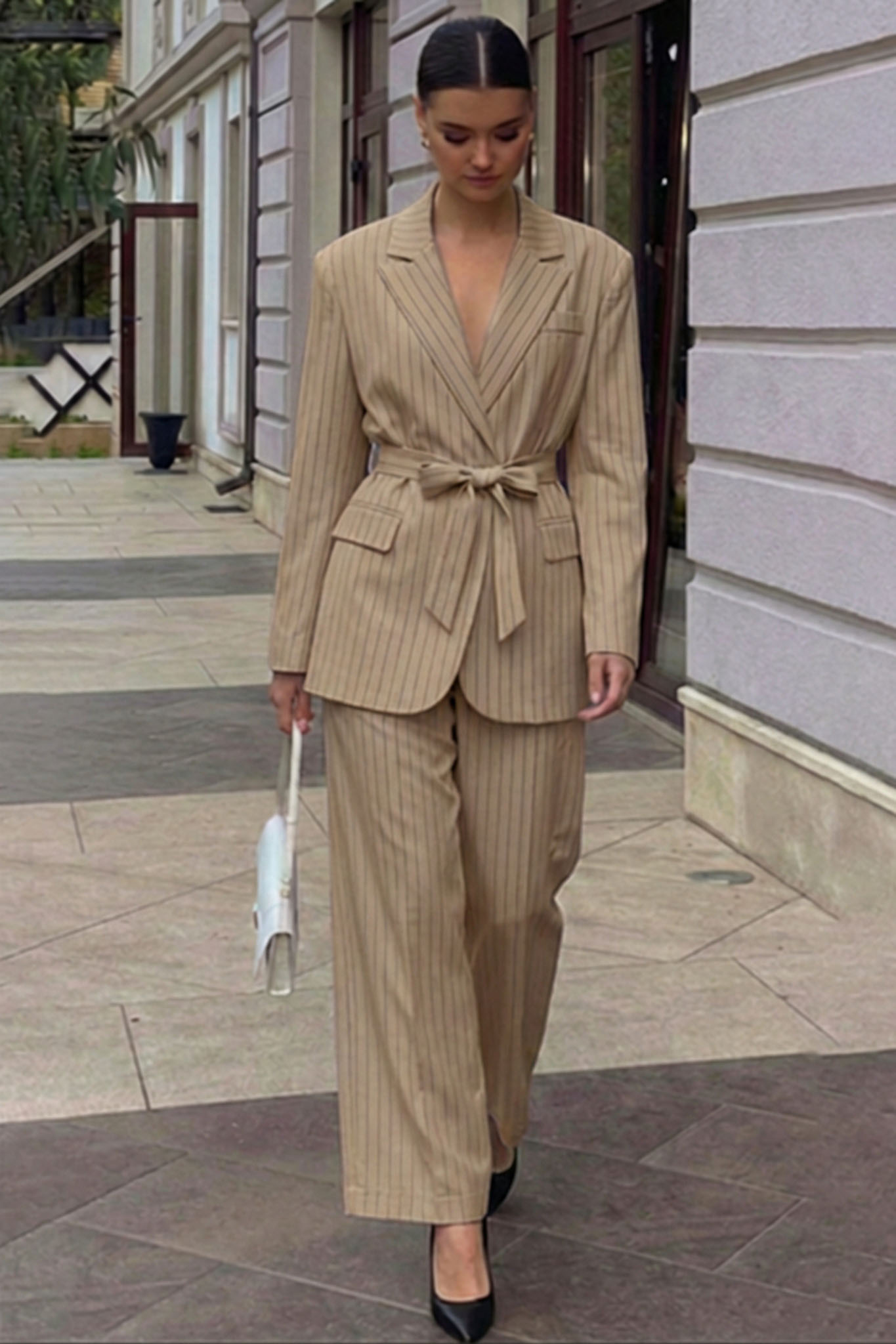 Σετ σακάκι παντελόνι με ρίγες. Το σετ αποτελείται από ένα σακάκι με κλασικό πέτο και τσέπες, το οποίο δένει στη μέση με μια ασορτί υφασμάτινη ζώνη, προσδίδοντας θηλυκότητα και τονίζοντας τη σιλουέτα. Το παντελόνι, σε φαρδιά (wide-leg) ή ίσια γραμμή, ολοκληρώνει το σύνολο με άνεση και φινέτσα. Κατασκευασμένο από ανάλαφρο ύφασμα, είναι η ιδανική επιλογή για εντυπωσιακές, επαγγελματικές ή επίσημες εμφανίσεις.