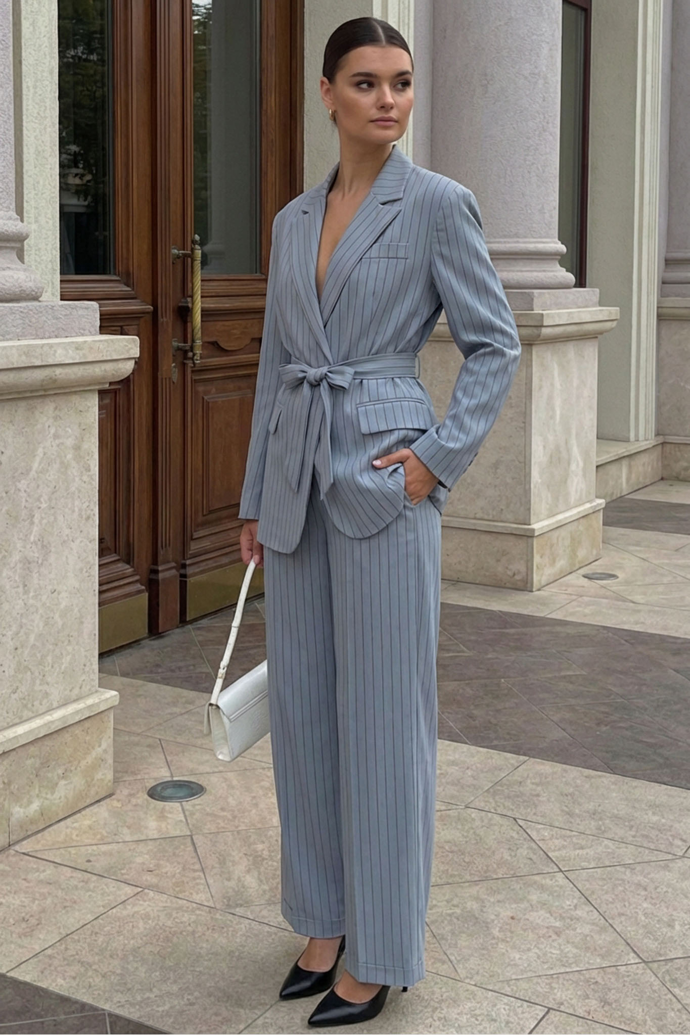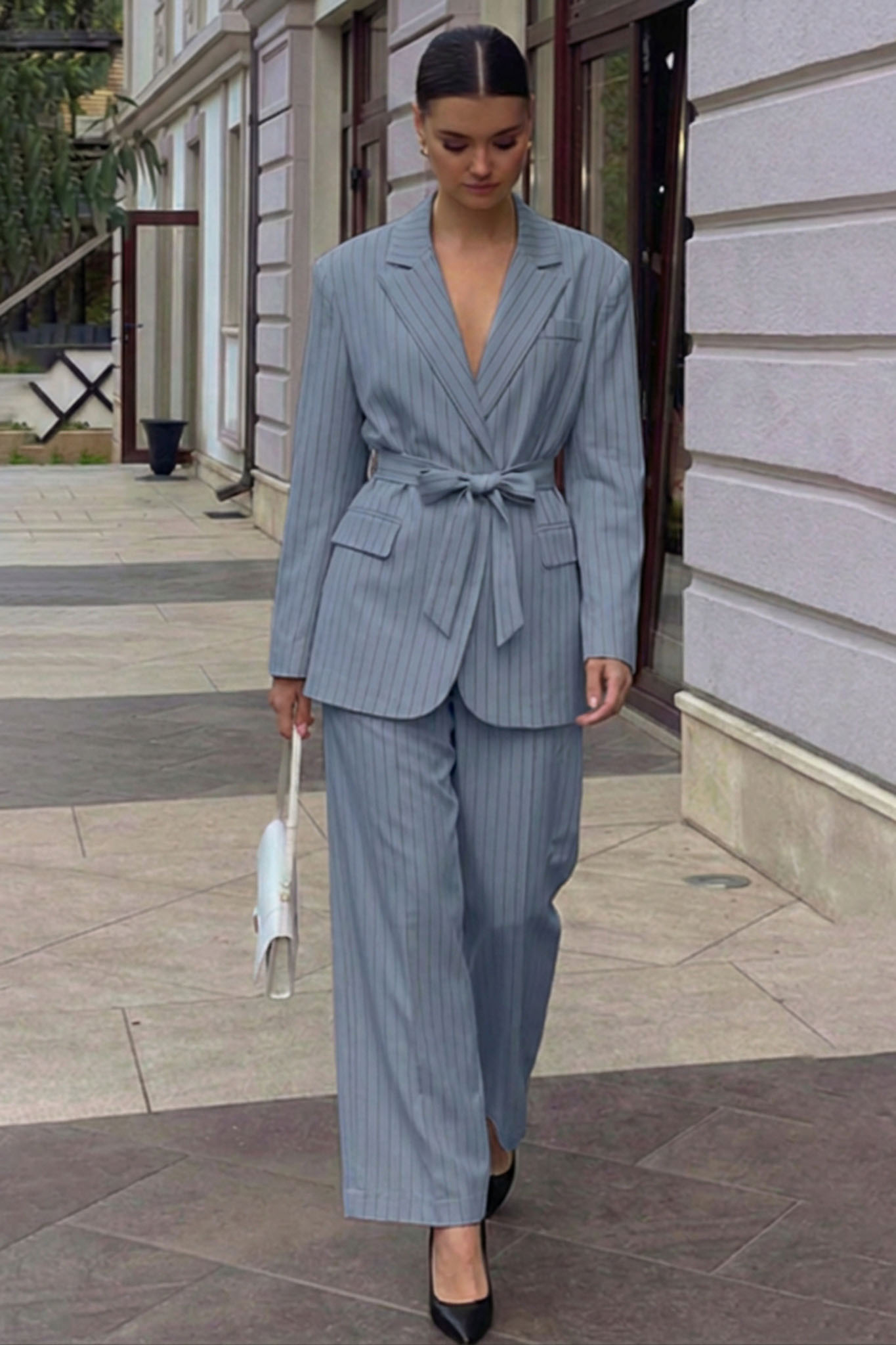 Σετ σακάκι παντελόνι με ρίγες. Το σετ αποτελείται από ένα σακάκι με κλασικό πέτο και τσέπες, το οποίο δένει στη μέση με μια ασορτί υφασμάτινη ζώνη, προσδίδοντας θηλυκότητα και τονίζοντας τη σιλουέτα. Το παντελόνι, σε φαρδιά (wide-leg) ή ίσια γραμμή, ολοκληρώνει το σύνολο με άνεση και φινέτσα. Κατασκευασμένο από ανάλαφρο ύφασμα, είναι η ιδανική επιλογή για εντυπωσιακές, επαγγελματικές ή επίσημες εμφανίσεις.