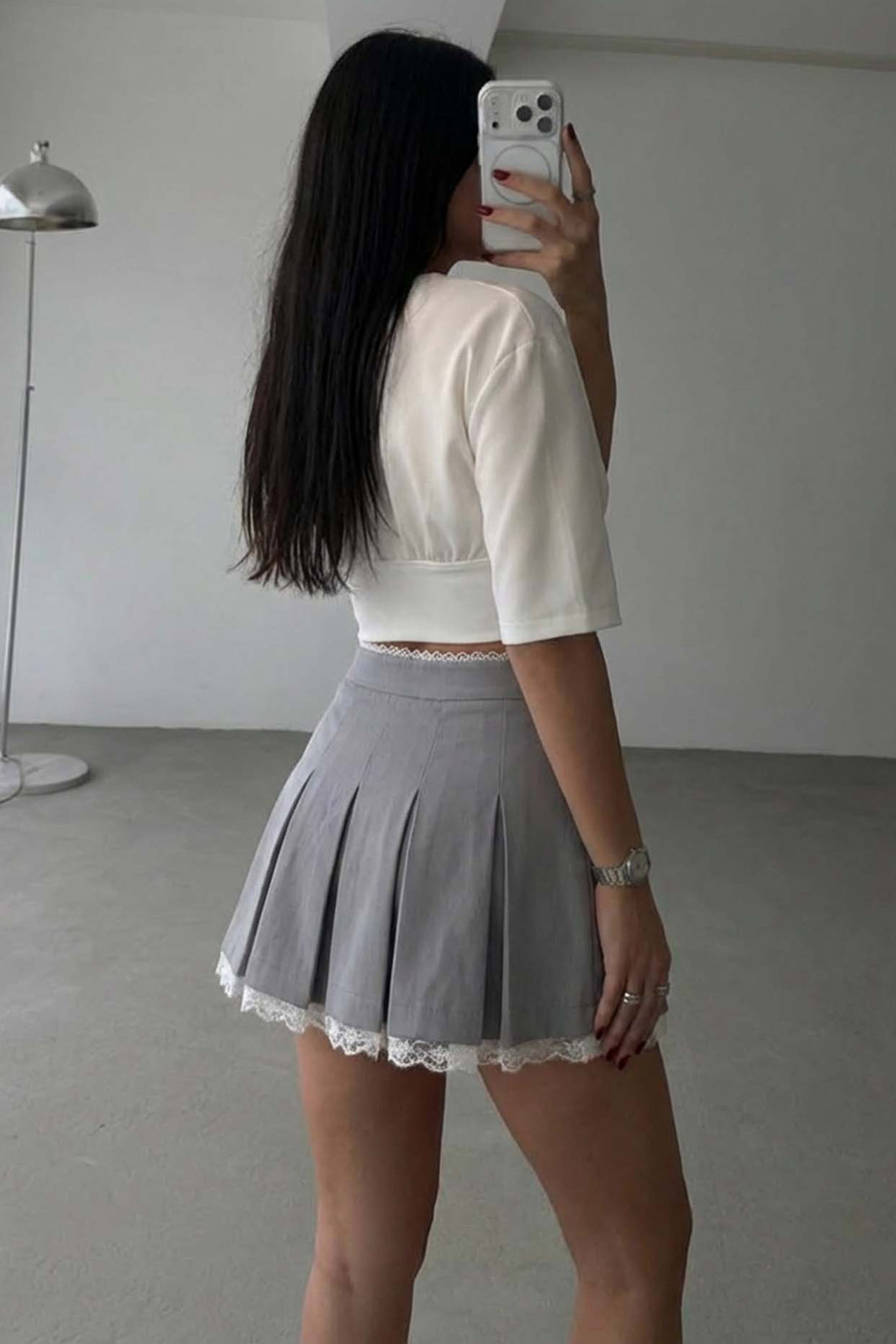 Φούστα μίνι με πιέτες και δαντέλα στο τελείωμα.
