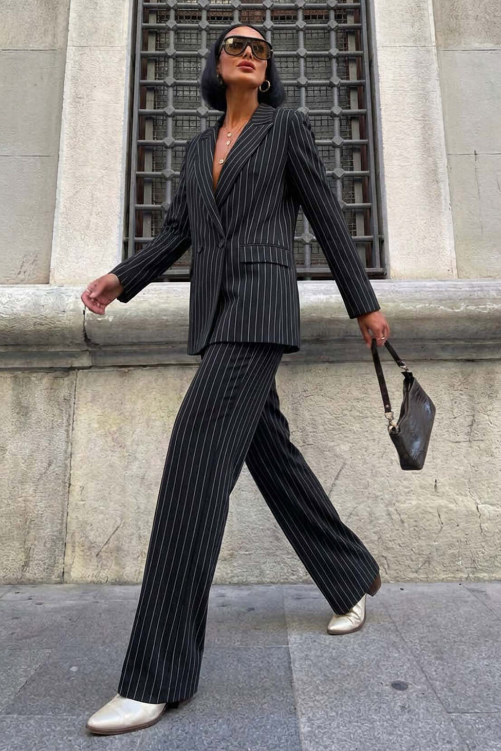 Κοστούμι με λεπτή ριγέ ύφανση. Αποτελείται από μεσάτο σταυρωτό σακάκι με βάτες και ψηλόμεση φαρδιά παντελόνα.