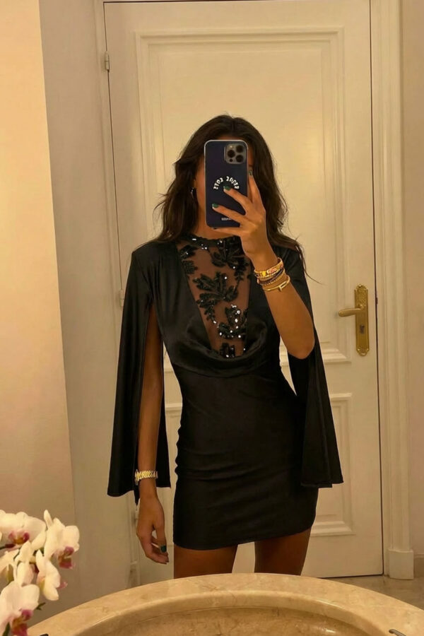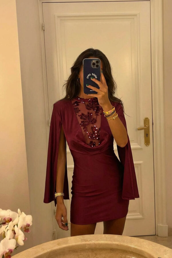 Μίντι φόρεμα εφαρμοστό, φλοράλ, από ελαστικό τούλι, με φόδρα εσωτερικά, με μακριά μανίκια και ελέυθερους ώμους. Μήκος 125cm στήθος 40cm μανίκι 60cm