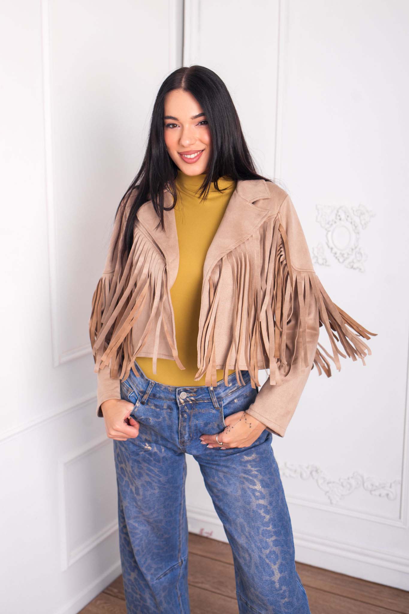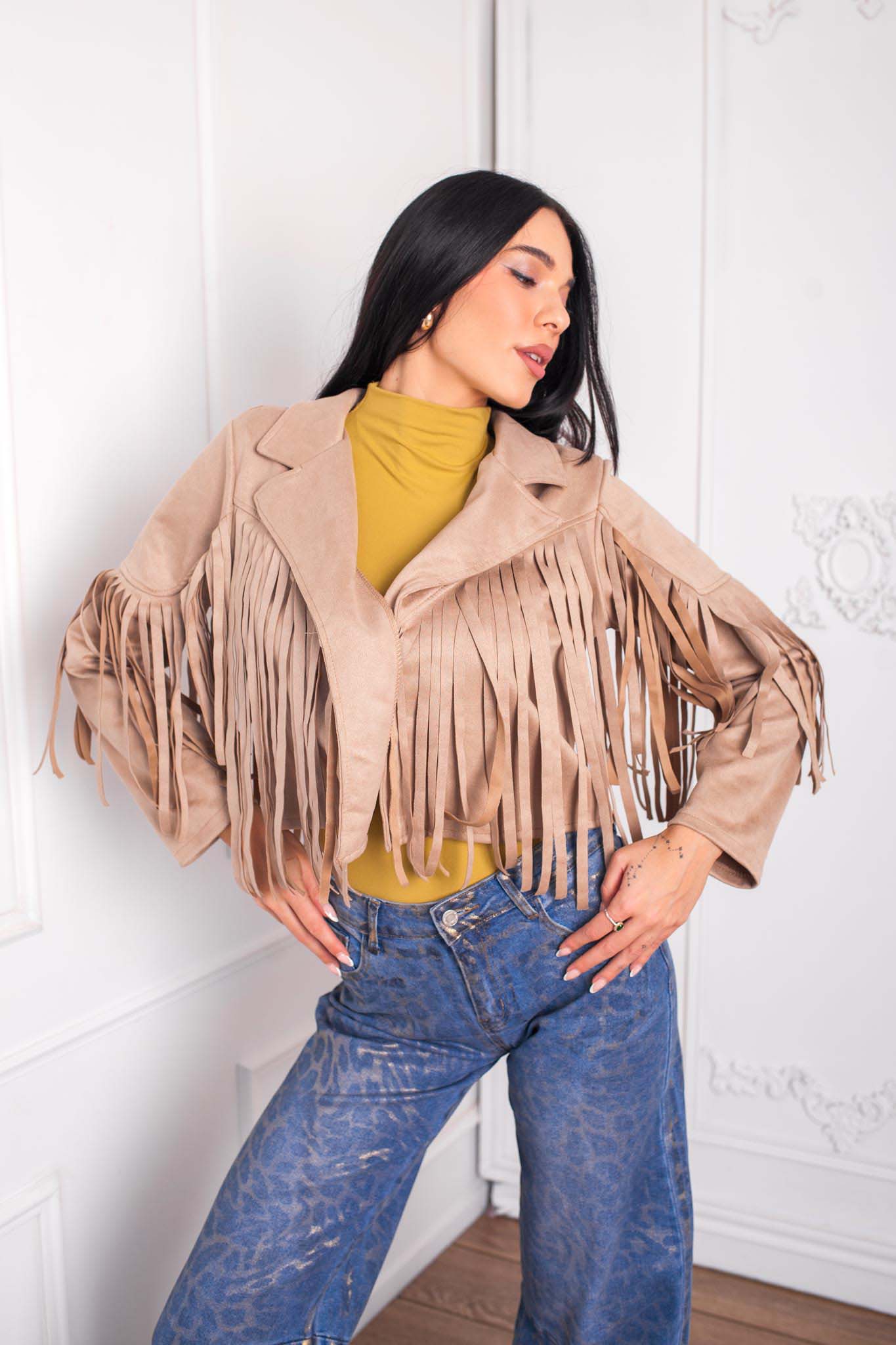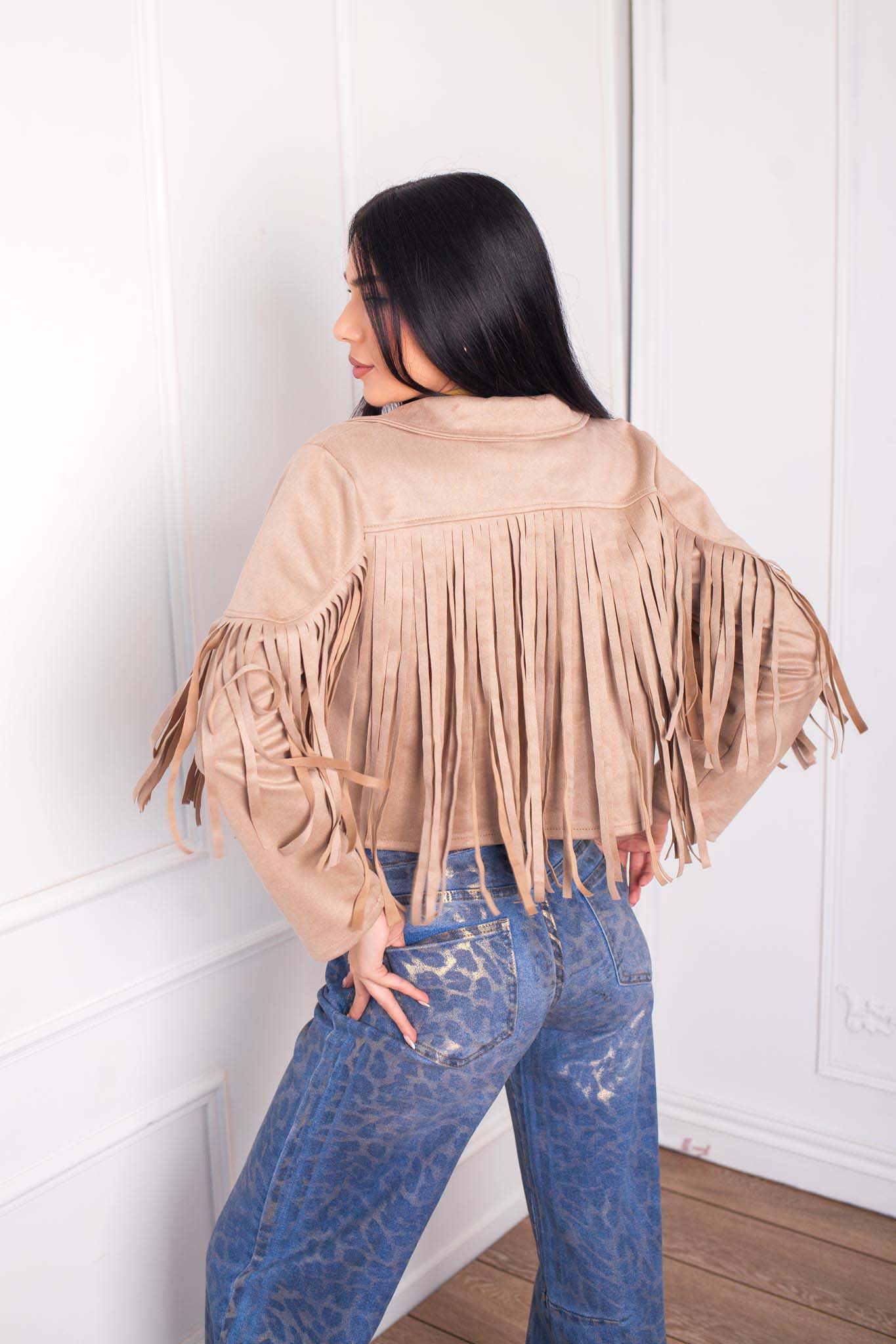 Τζάκετ με κρόσια. Μήκος 50cm, στήθος 120cm, μανίκι 62cm.