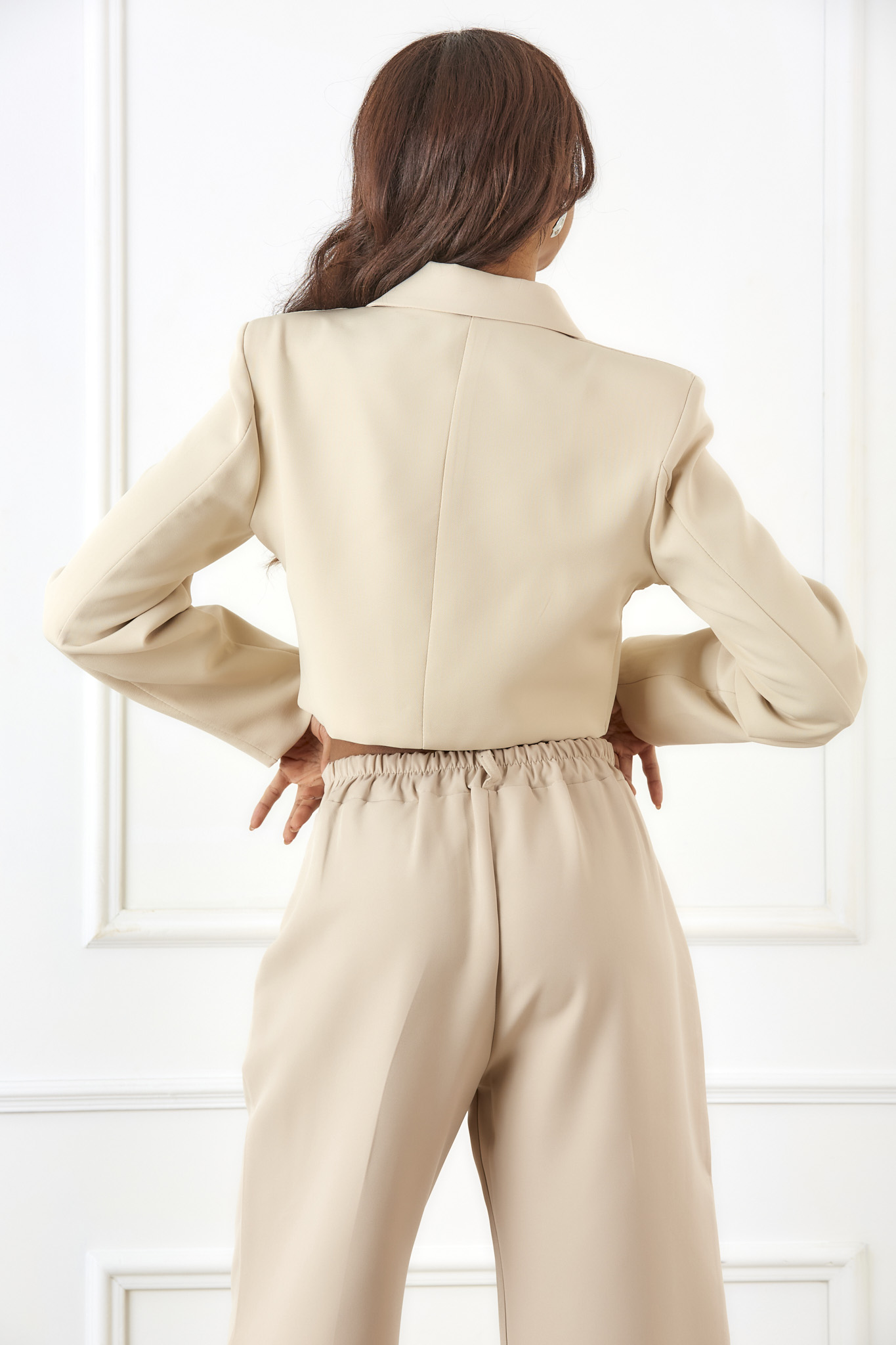 Εντυπωσιακό cropped σακάκι. Διαθέτει κλασικό γιακά με πέτο και κλείσιμο με δύο κουμπιά στην ίδια απόχρωση για ένα clean και μίνιμαλ αποτέλεσμα.