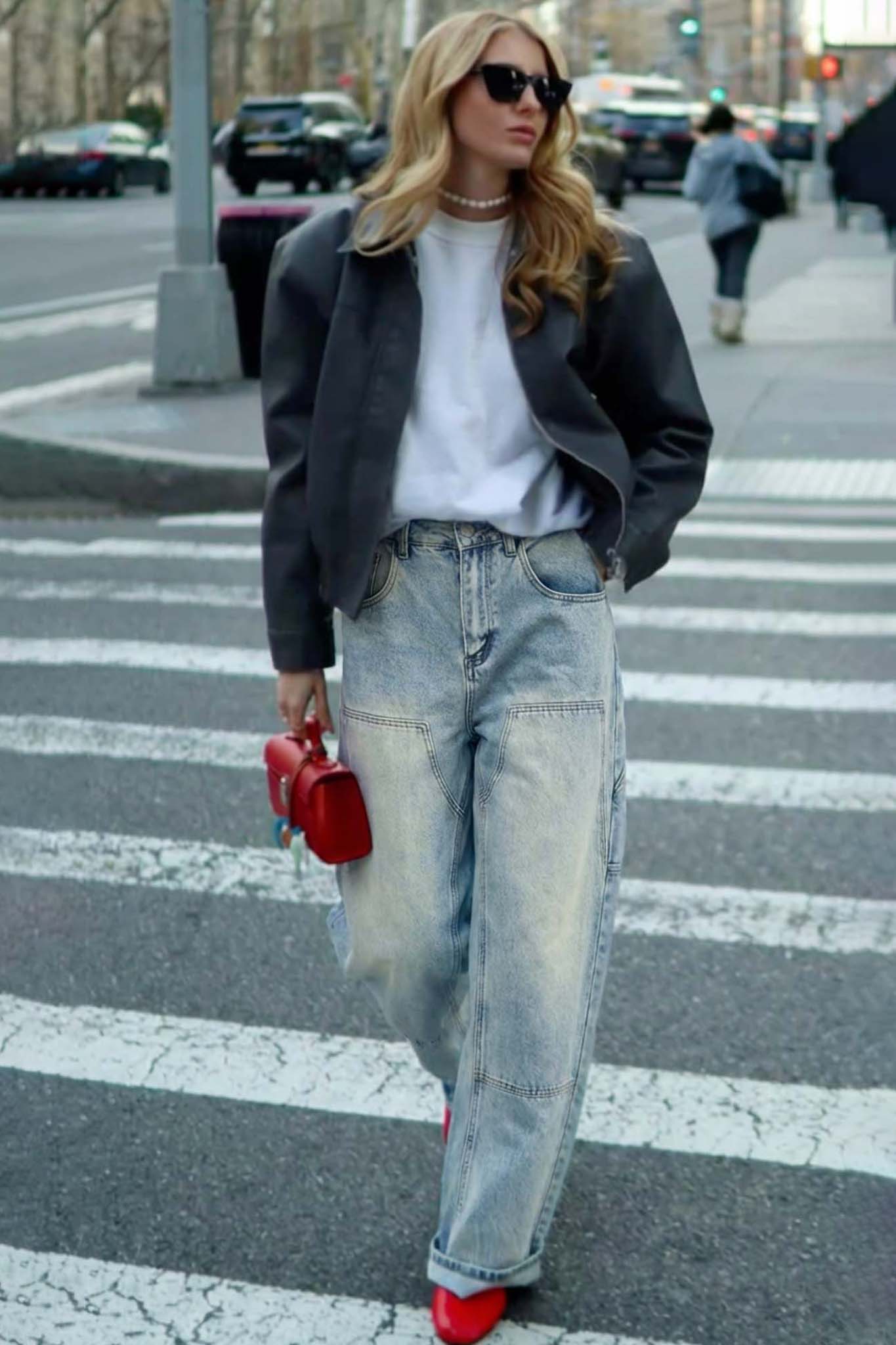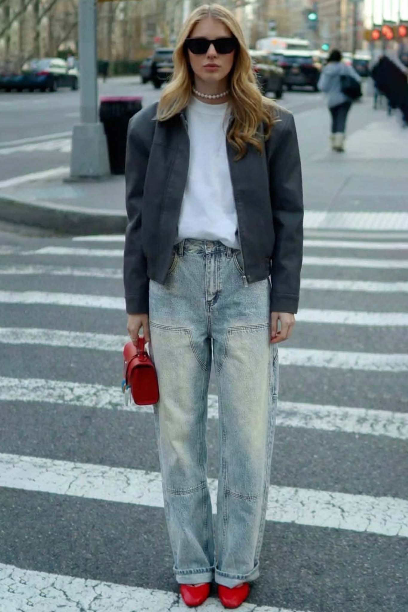 Τζιν με ψηλή μέση και φαρδιά-ίσια γραμμή. Είναι κατασκευασμένο από βαμβακερό τζιν ύφασμα σε ξασπρισμένη απόχρωση. Διαθέτει πρόσθετες τσέπες και ενισχυμένες ραφές στα γόνατα και έχει φθαρμένο τελείωμα.