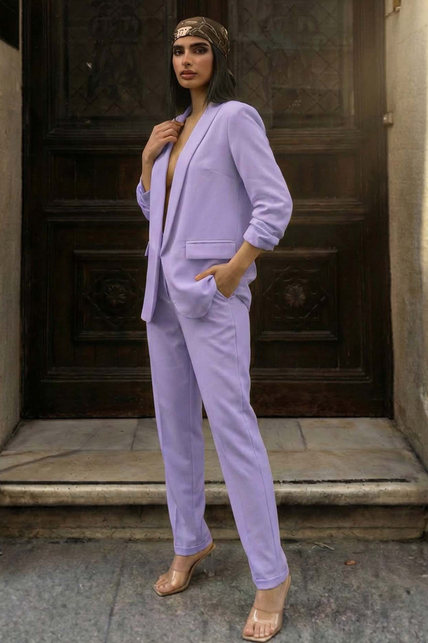 Σετ το οποίο αποτελείται από σακάκι με πέτο και βάτες που δίνουν δομή στους ώμους, και παντελόνι σε ίσια γραμμή, προσφέροντας ένα κομψό και δυναμικό σύνολο ιδανικό για όλες τις ώρες.
