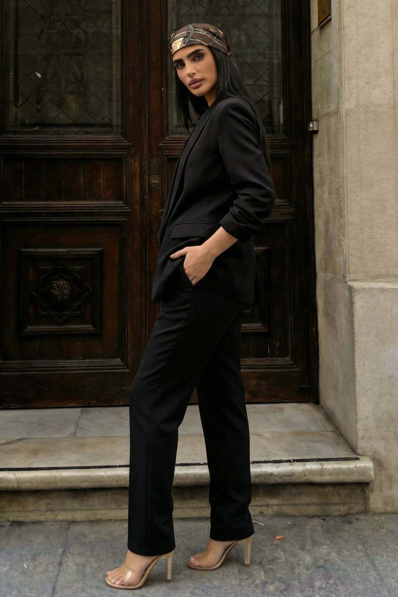 Σετ το οποίο αποτελείται από σακάκι με πέτο και βάτες που δίνουν δομή στους ώμους, και παντελόνι σε ίσια γραμμή, προσφέροντας ένα κομψό και δυναμικό σύνολο ιδανικό για όλες τις ώρες.