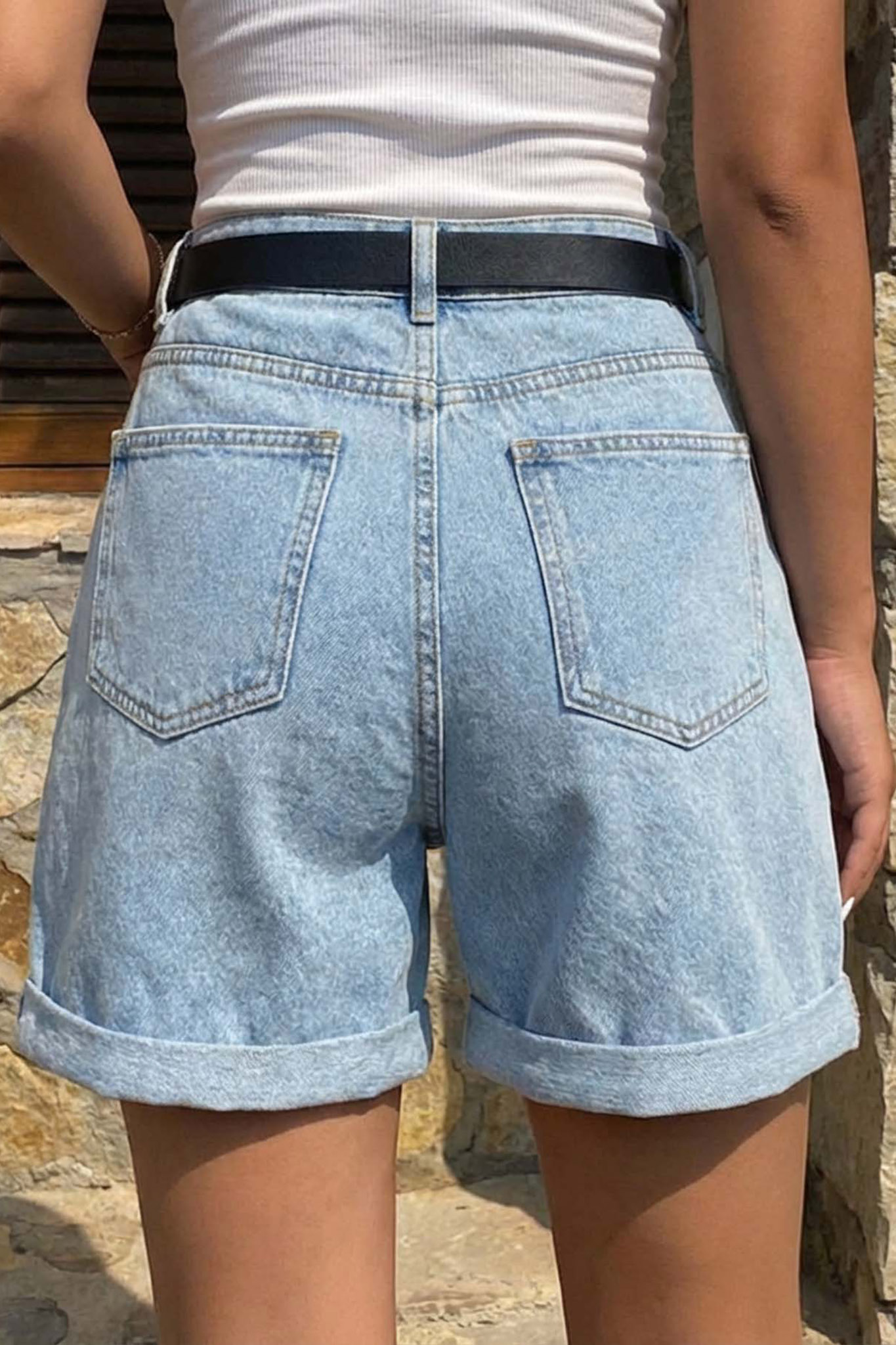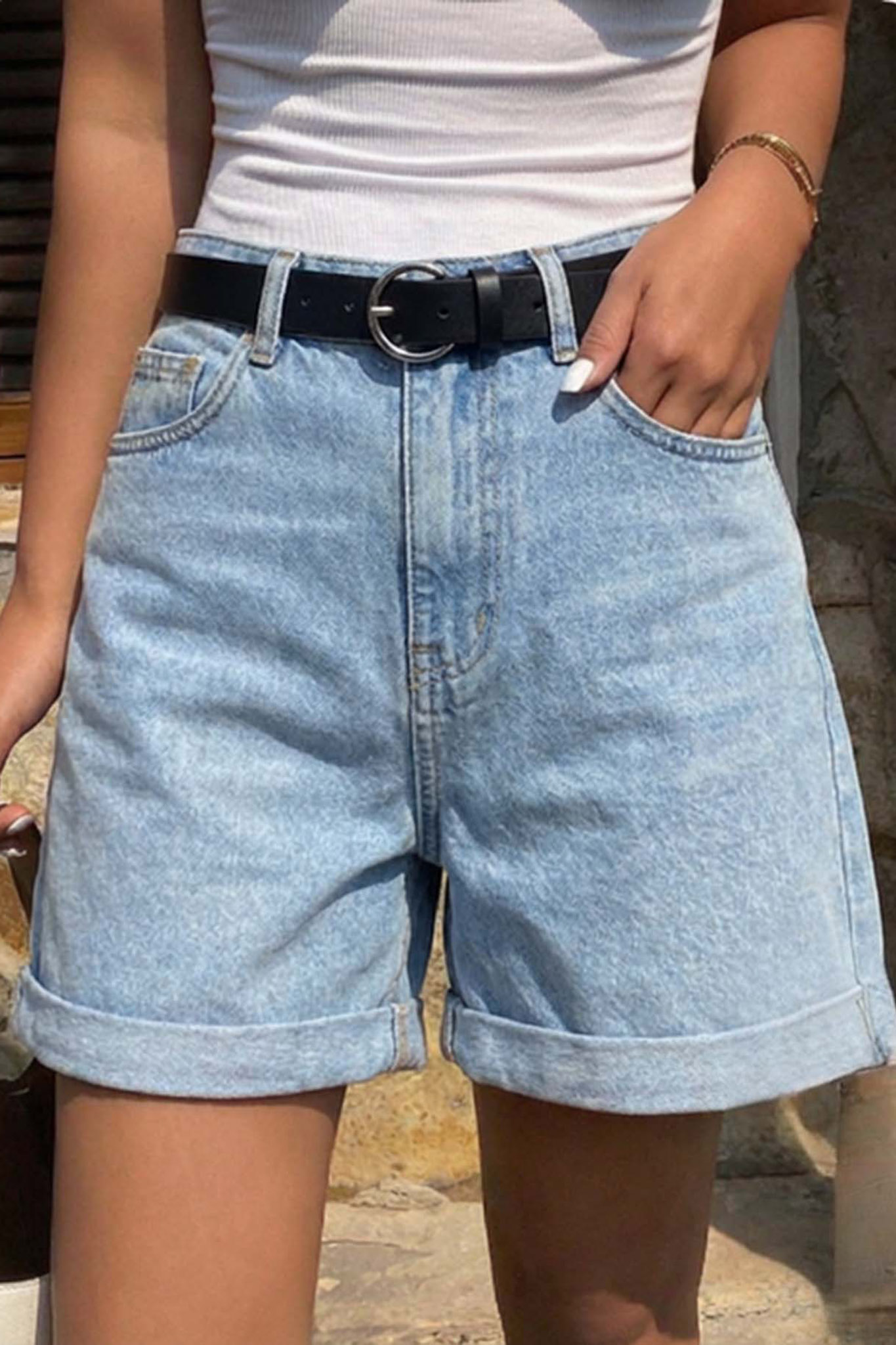 Τζιν σορτς με ρεβέρ στο τελείωμα. Διαθέτει ζωνάκι στη μέση για πιο άνετη εφαρμογή.