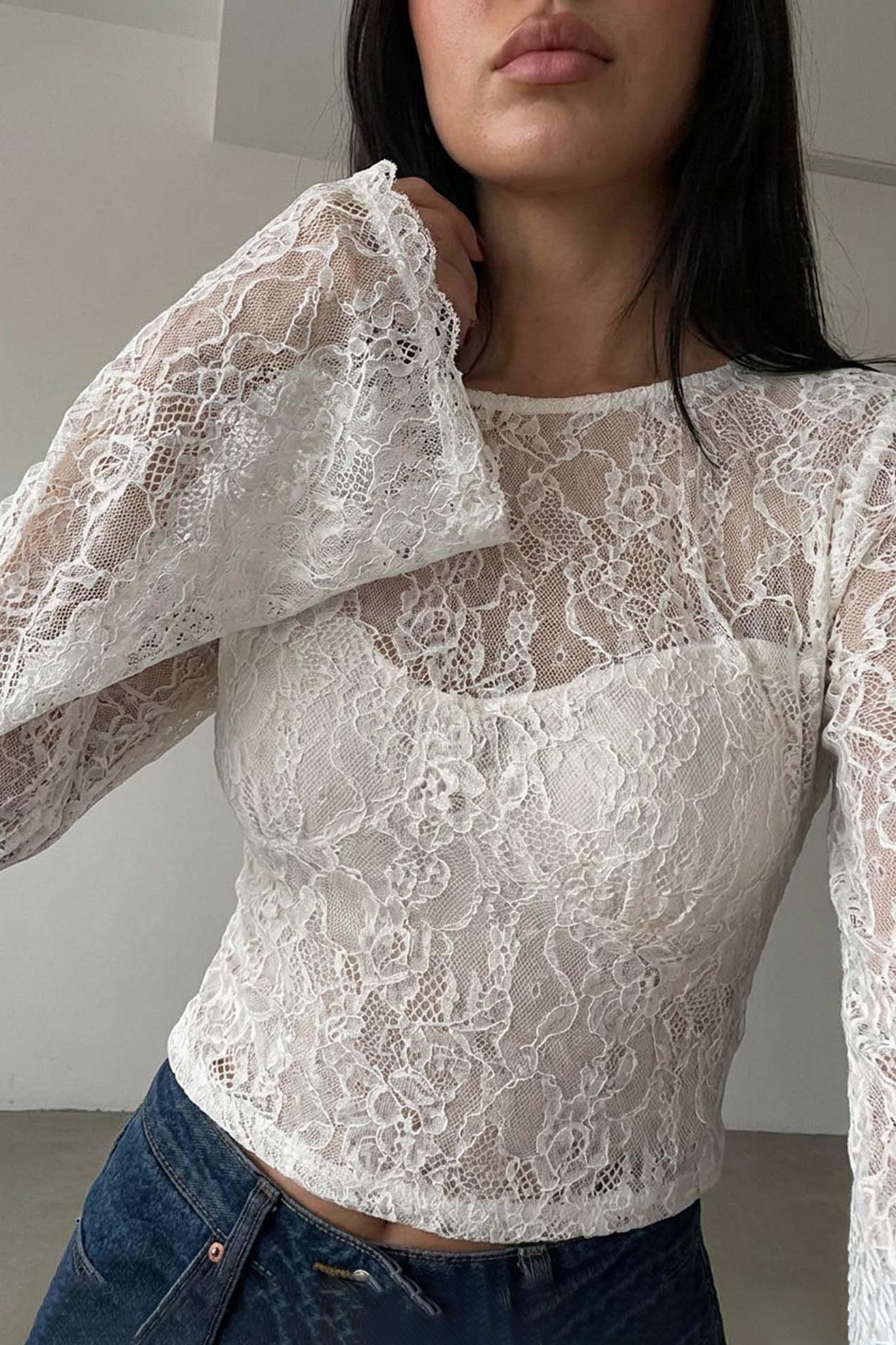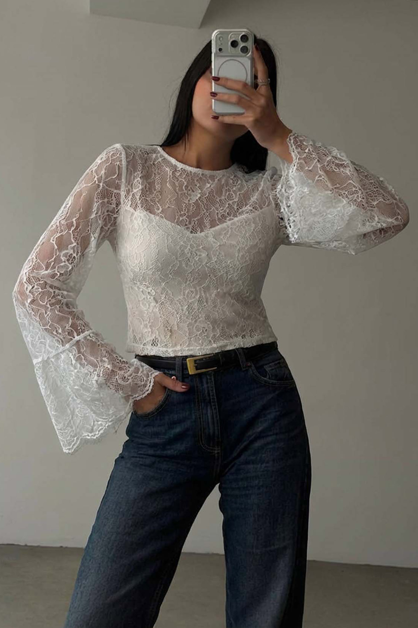 Premoτοπ δαντέλα με μανίκια καμπάνα λευκό