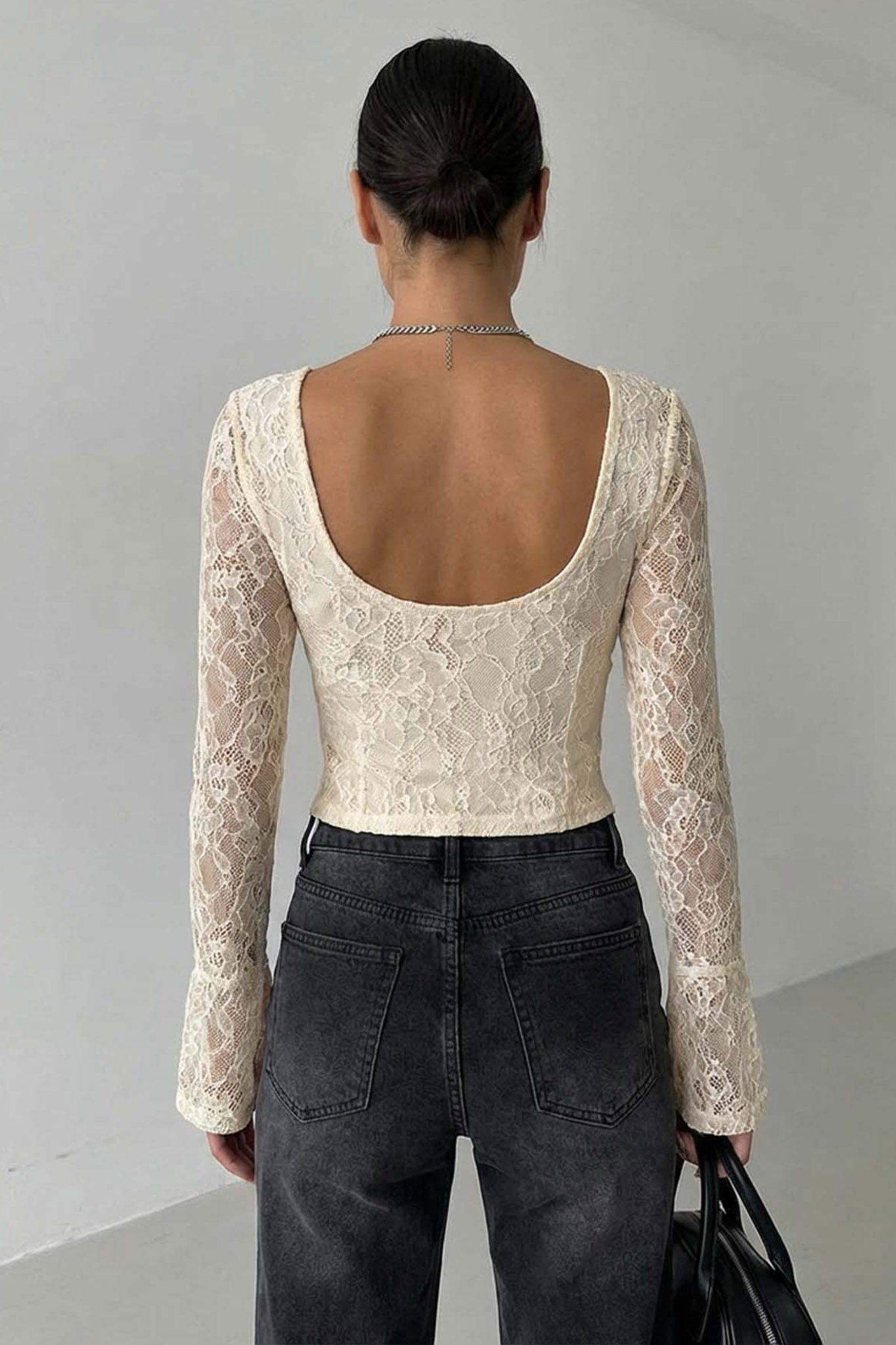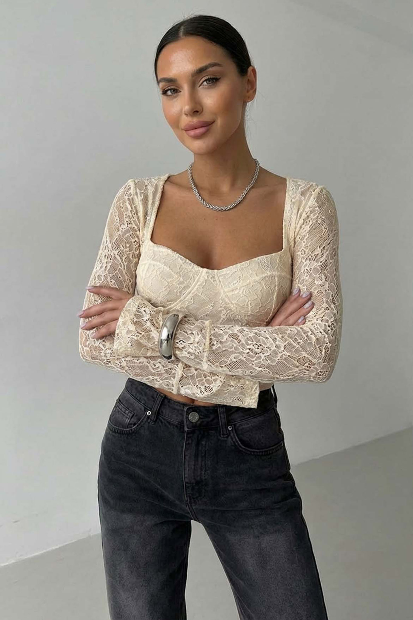 Μπλούζα δαντέλα με ενισχυμένα cups και κομψή τετράγωνη λαιμόκοψη. Διαθέτει μακριά μανίκια με ελαφρύ άνοιγμα στο τελείωμα και στενή εφαρμογή που σμιλεύει τη μέση.