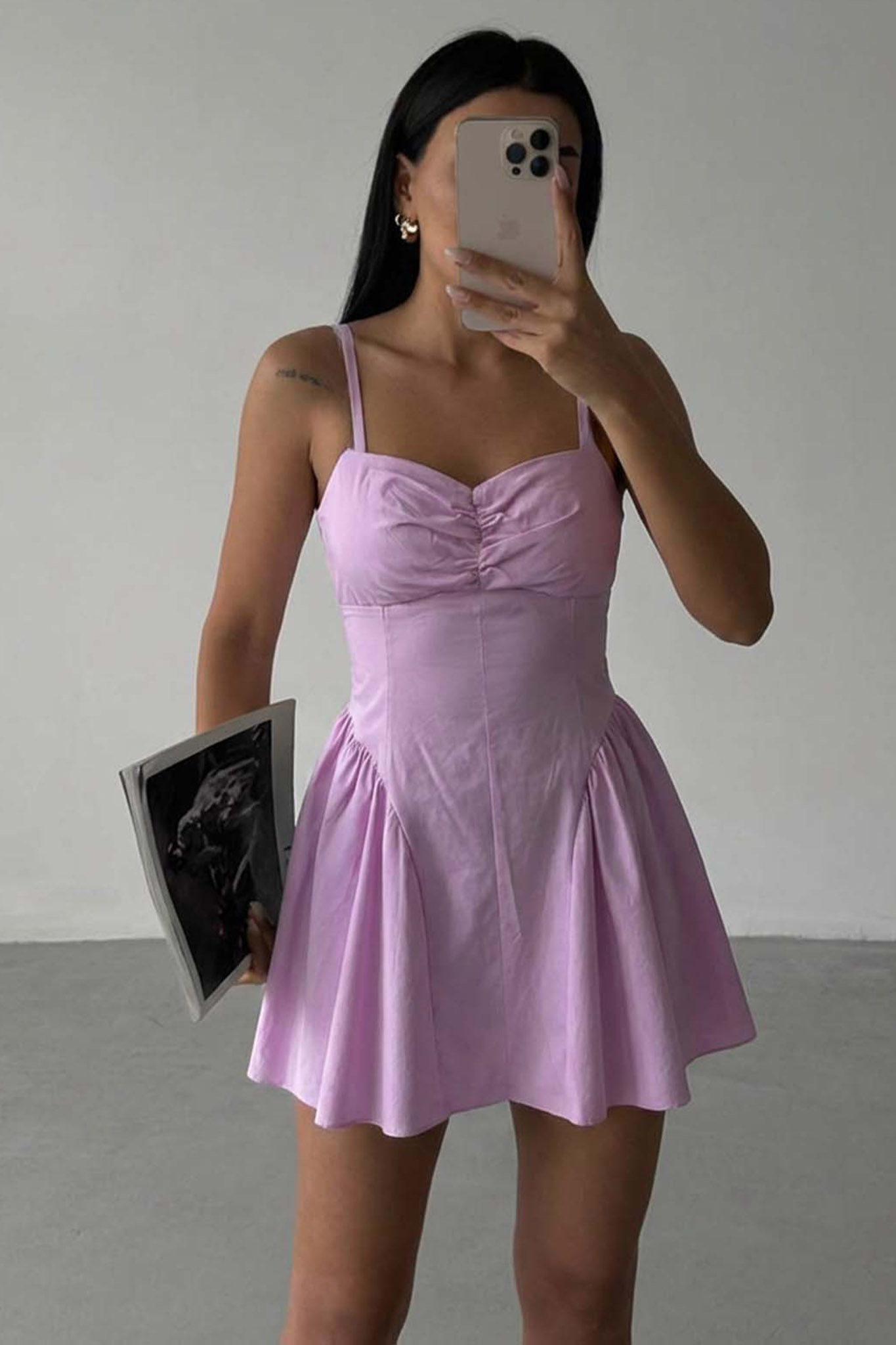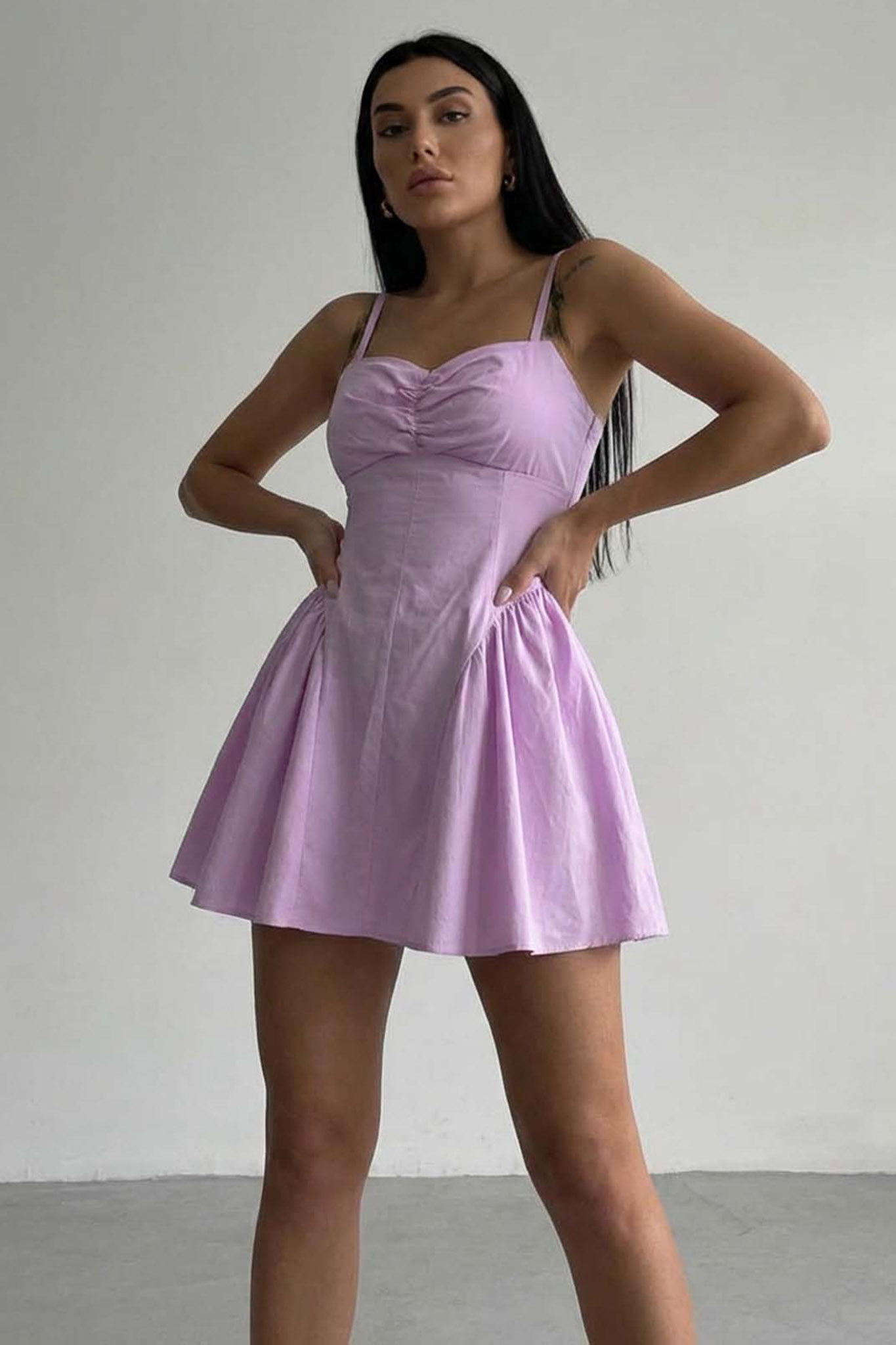 Μίνι φόρεμα με ρυθμιζόμενες τιράντες σπαγκέτι και σούρες στο μπούστο.