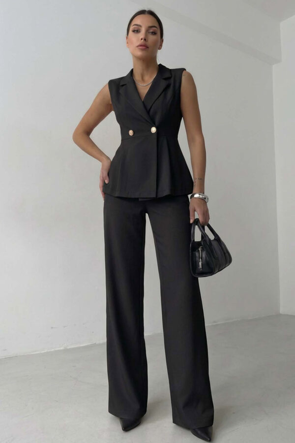 Σετ κουστούμι που αποτελείται από μεσάτο αμάνικο γιλέκο με χρυσά κουμπιά και ψηλόμεση φαρδιά παντελόνα. Είναι ένα σικάτο και δυναμικό σύνολο, ιδανικό για επαγγελματικές εμφανίσεις ή βραδινές εξόδους, που συνδυάζει την κλασική κομψότητα με μια μοντέρνα πινελιά.