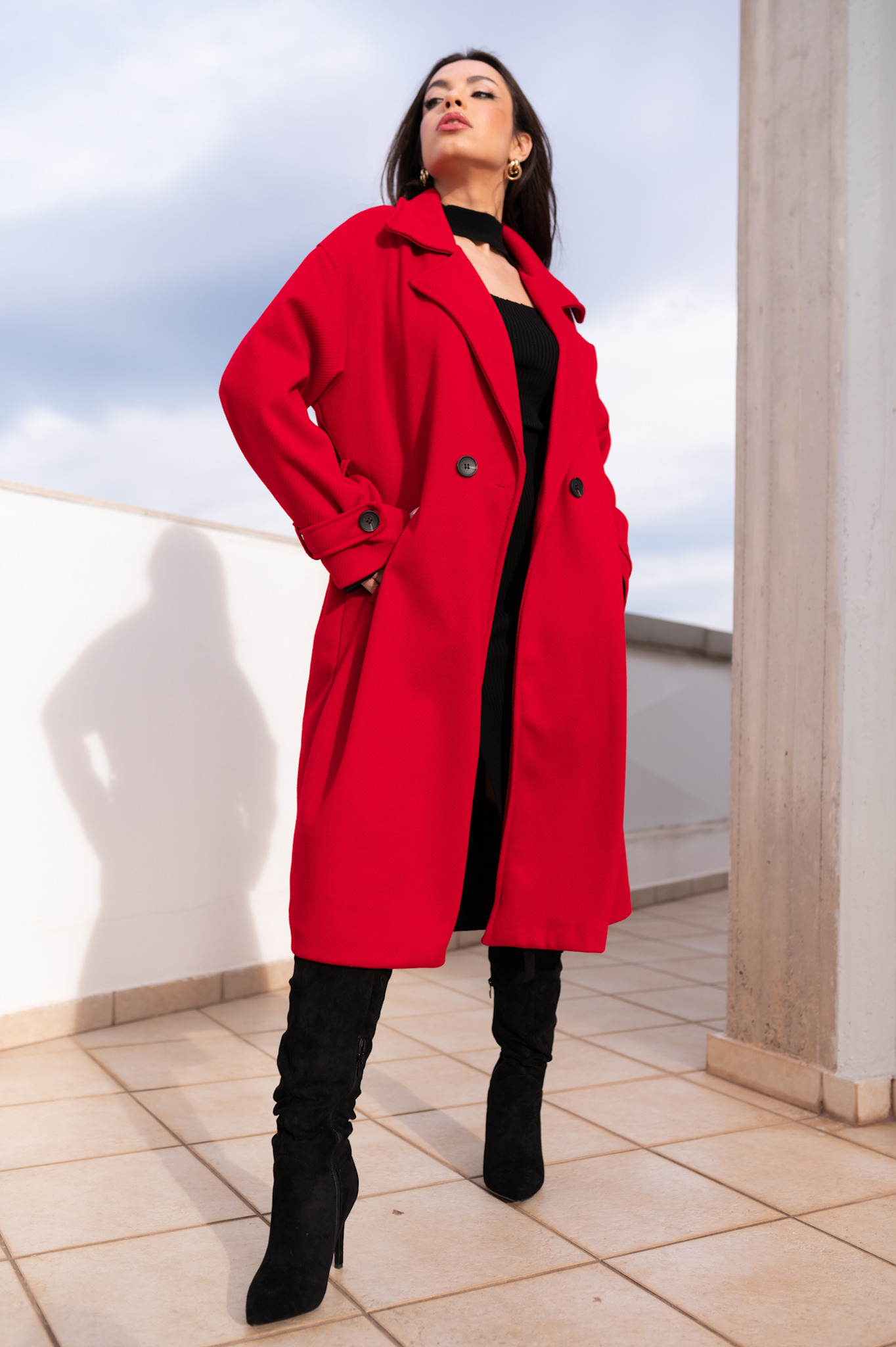 Μακρύ παλτό με πέτο, διπλή σειρά από κουμπιά, τσέπες και ζώνη. Μήκος 106cm στήθος 50cm μανίκι 52cm