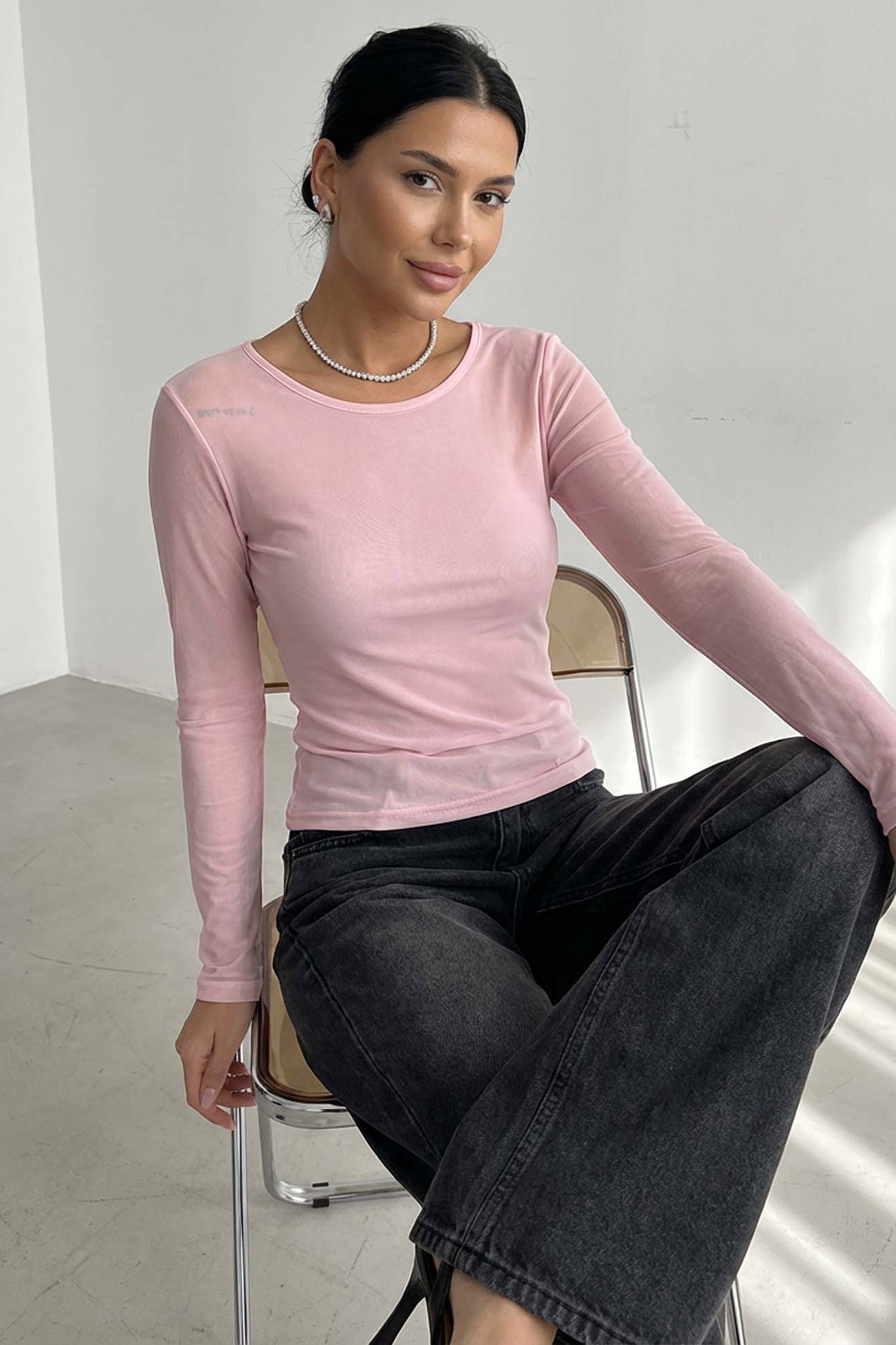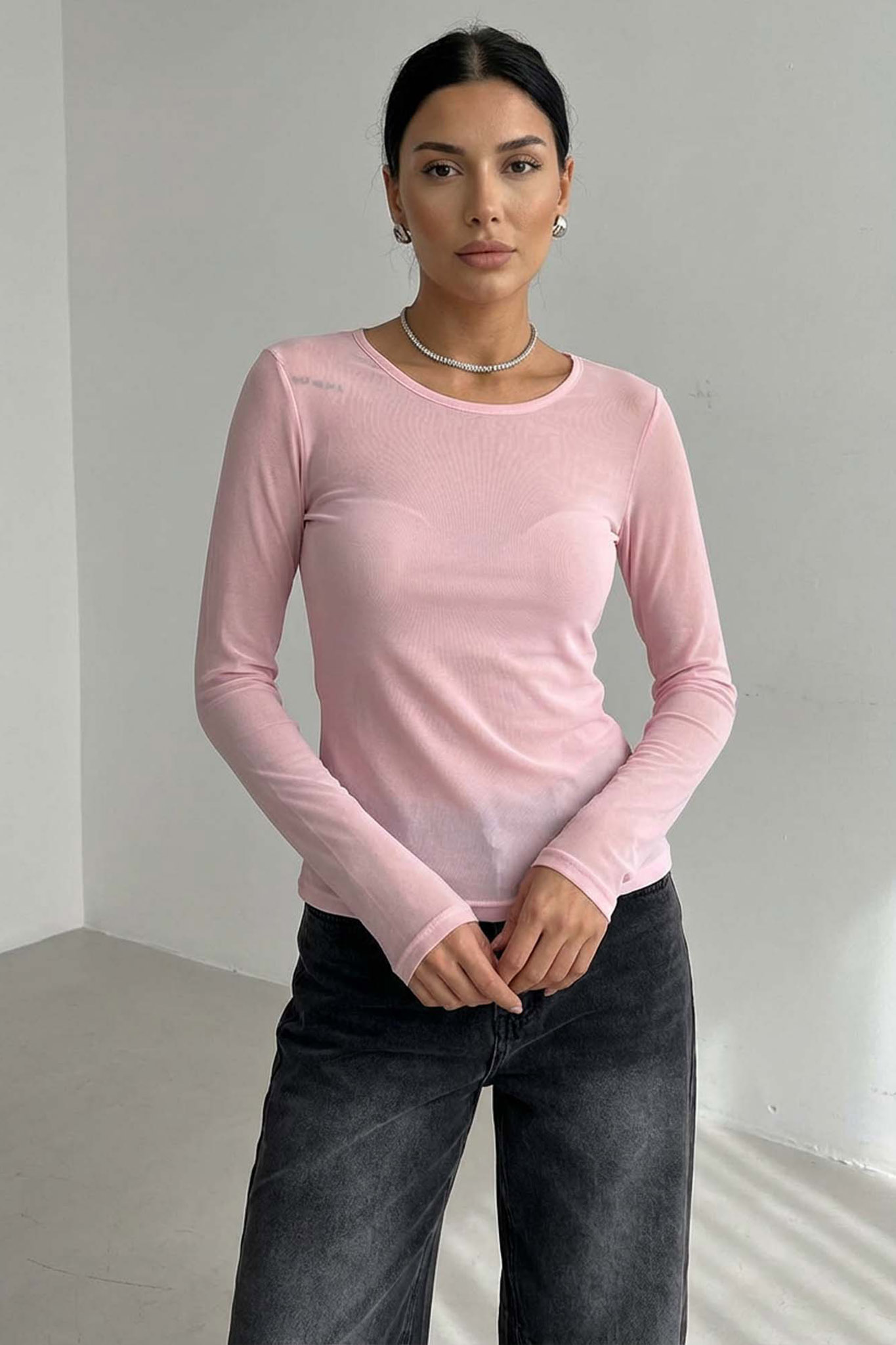 Διαφανή μπλούζα με μακρύ μανίκι και στρογγυλή λαιμόκοψη. Είναι ένα λεπτό και μαλακό κομμάτι, ιδανικό για layering ή για μια κομψή βραδινή εμφάνιση.