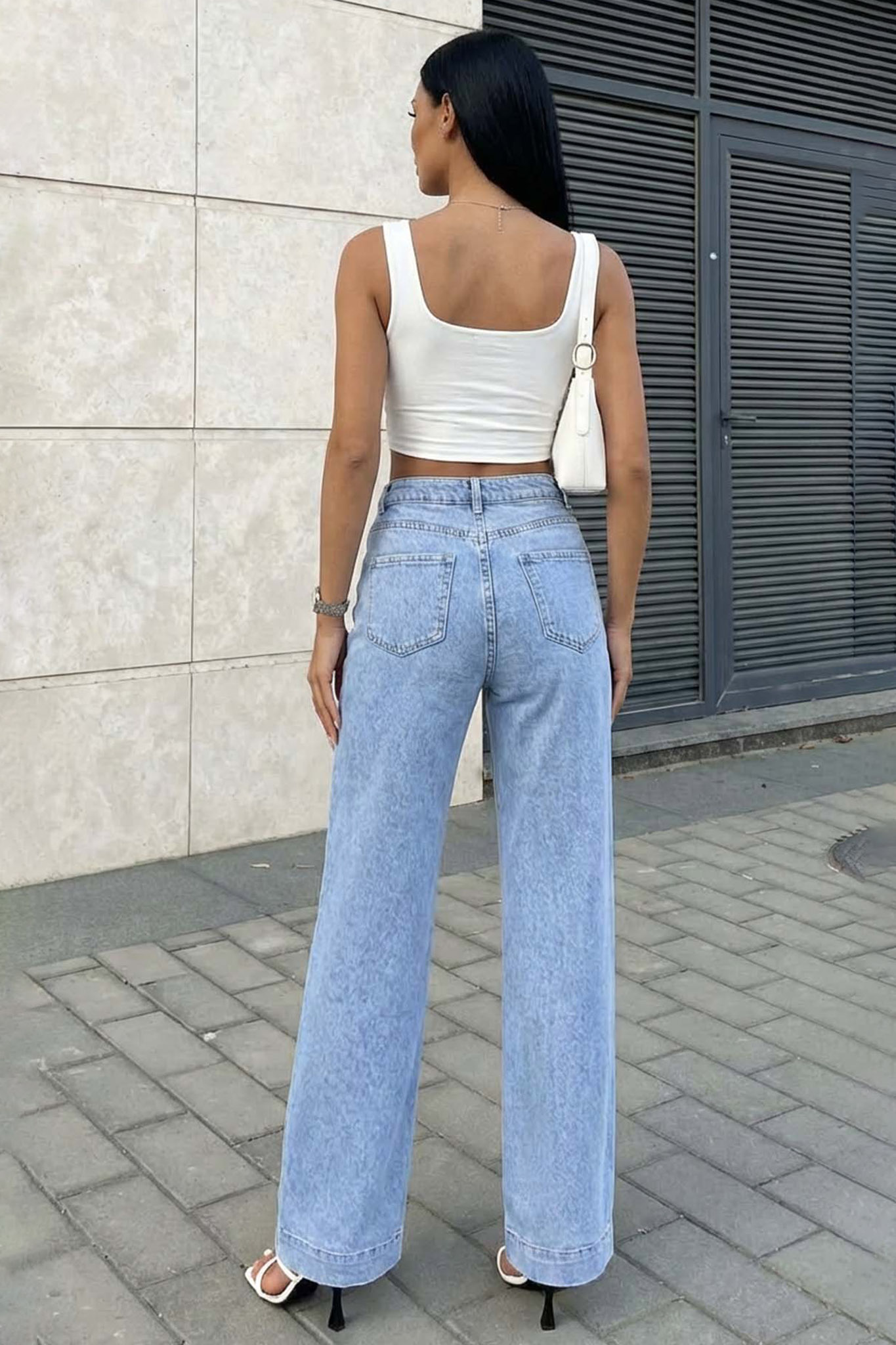 Ανανεώστε τις καθημερινές σας εμφανίσεις με αυτό το wide-leg τζιν σε ανοιχτή μπλε απόχρωση, που αποτελεί την απόλυτη τάση της σεζόν. Ο συνδυασμός της άνετης, φαρδιάς γραμμής με το κλασικό denim ύφασμα προσφέρει ένα στυλάτο και ταυτόχρονα αβίαστο look για κάθε ώρα της ημέρας.