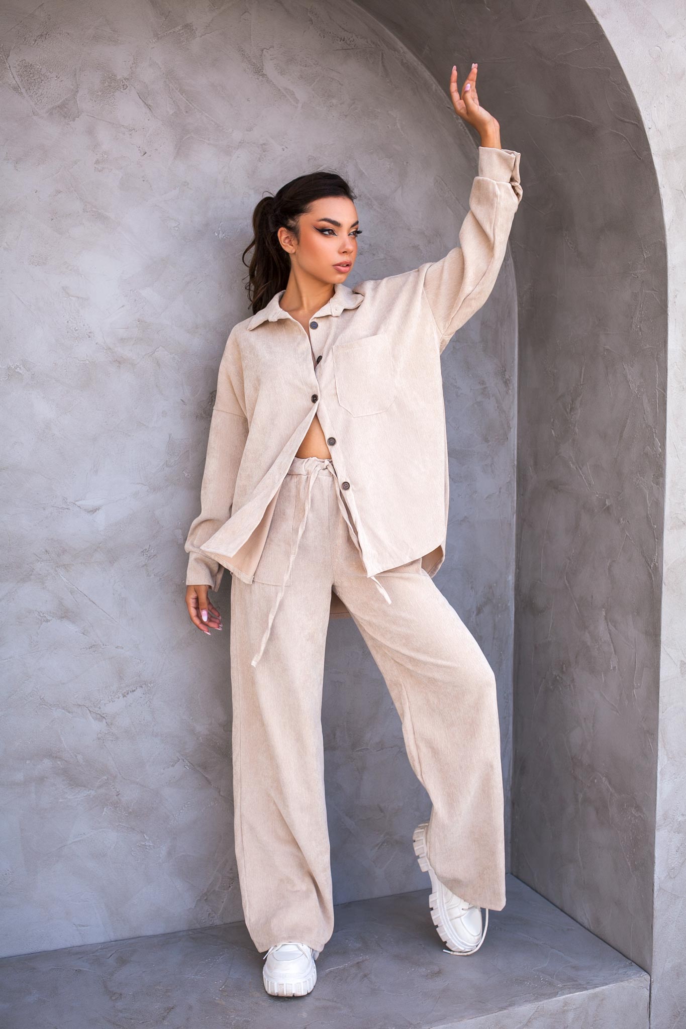 Σετ πουκάμισο κοτλε, κλείνει με κουμπιά μπροστά.Παντελόνα ψηλόμεση σε ίσια γραμμή με τσέπες και κορδόνι στη μέση.
