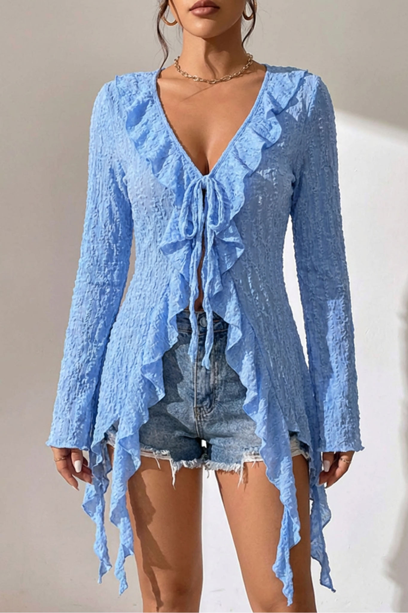Χαρακτηρίζεται από τα εντυπωσιακά βολάν στο ντεκολτέ και το κλείσιμο με κορδόνια μπροστά, προσφέροντας ένα ανάλαφρο και ρομαντικό στυλ.