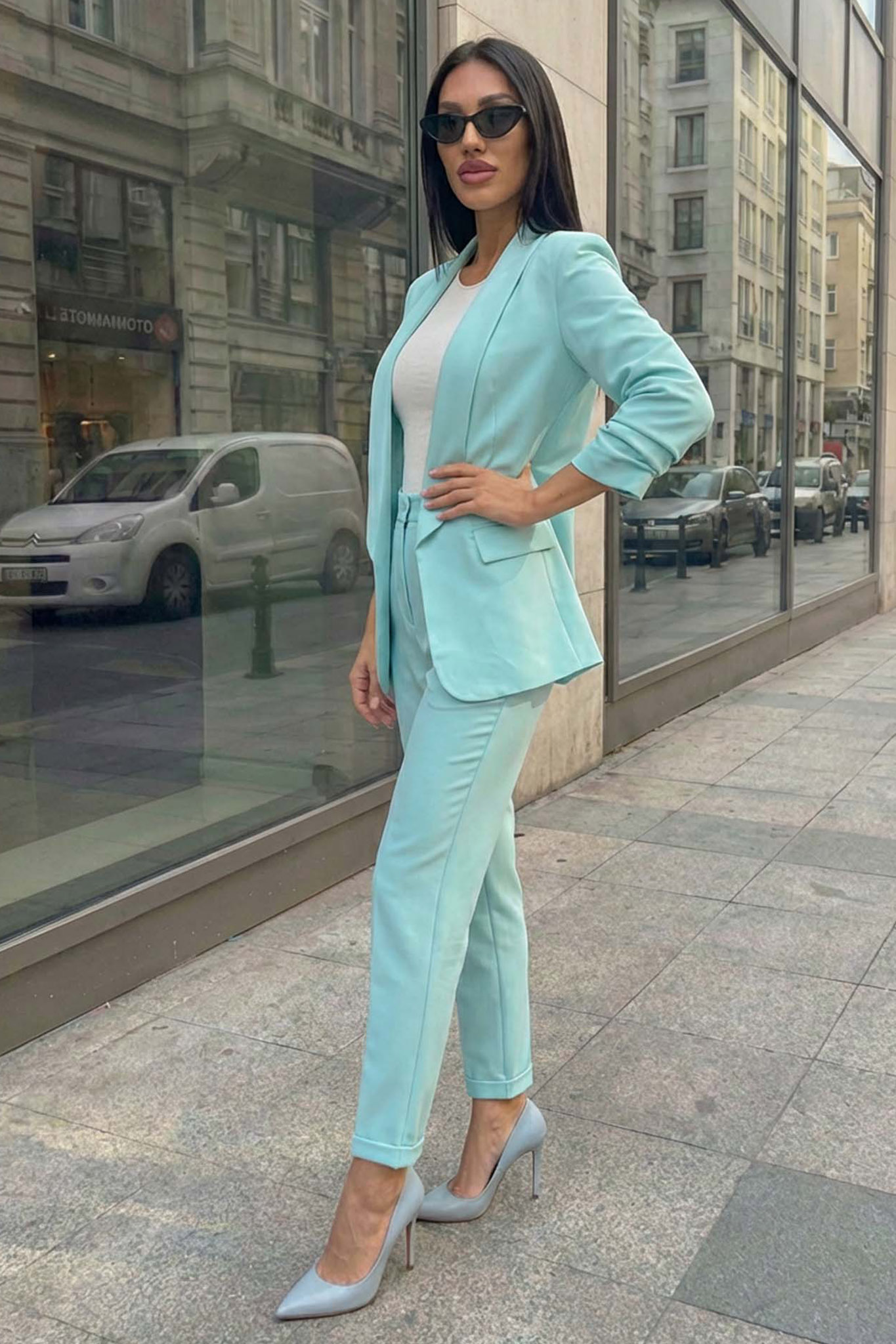 Σετ που αποτελείται από μεσάτο σακάκι με πέτο και αντίστοιχο παντελόνι σε slim-fit γραμμή. Είναι ένα κομψό και μοντέρνο σύνολο, ιδανικό για προσεγμένες εμφανίσεις στο γραφείο ή σε κοινωνικές εκδηλώσεις, προσφέροντας μια φρέσκια εναλλακτική στο κλασικό επαγγελματικό ντύσιμο.