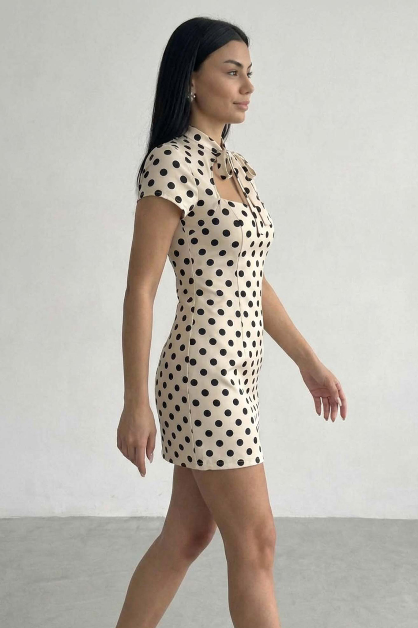 Μίνι πουά φόρεμα κοντομάνικο με δέσιμο στον λαιμό μπροστά. Το cut-out άνοιγμα στο στήθος που διαθέτει προσθέτει μια sexy νότα στην εμφάνιση.