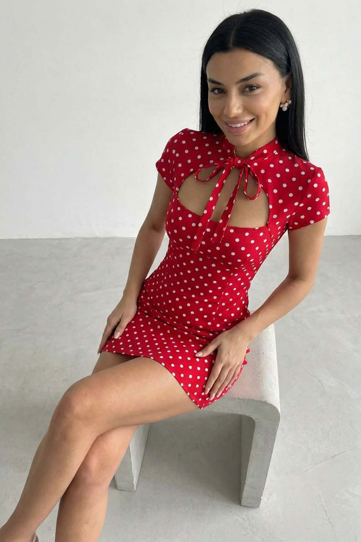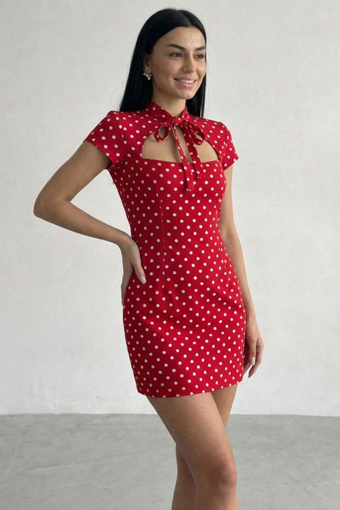 Μίνι πουά φόρεμα κοντομάνικο με δέσιμο στον λαιμό μπροστά. Το cut-out άνοιγμα στο στήθος που διαθέτει προσθέτει μια sexy νότα στην εμφάνιση.
