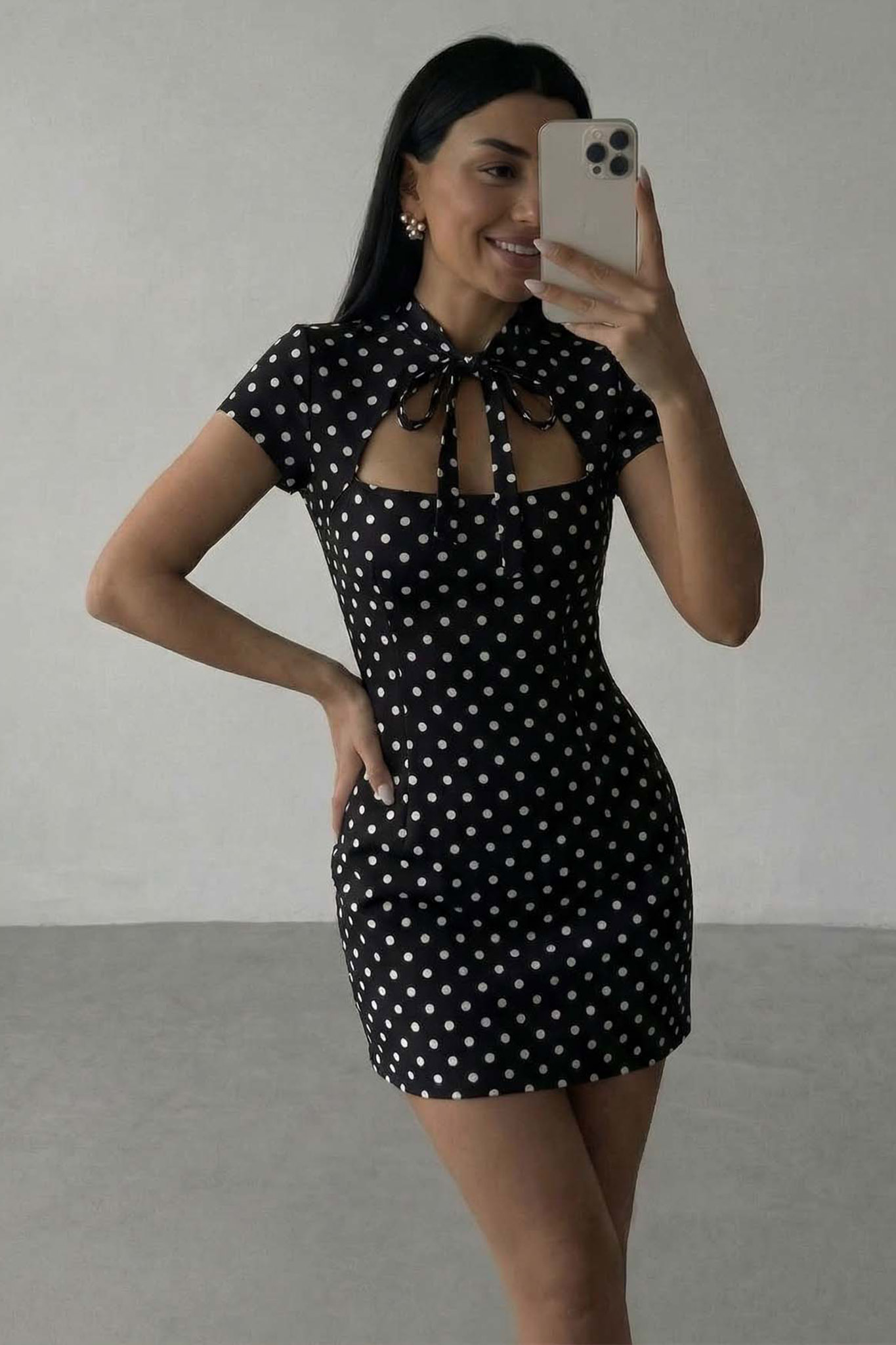 Μίνι πουά φόρεμα κοντομάνικο με δέσιμο στον λαιμό μπροστά. Το cut-out άνοιγμα στο στήθος που διαθέτει προσθέτει μια sexy νότα στην εμφάνιση.