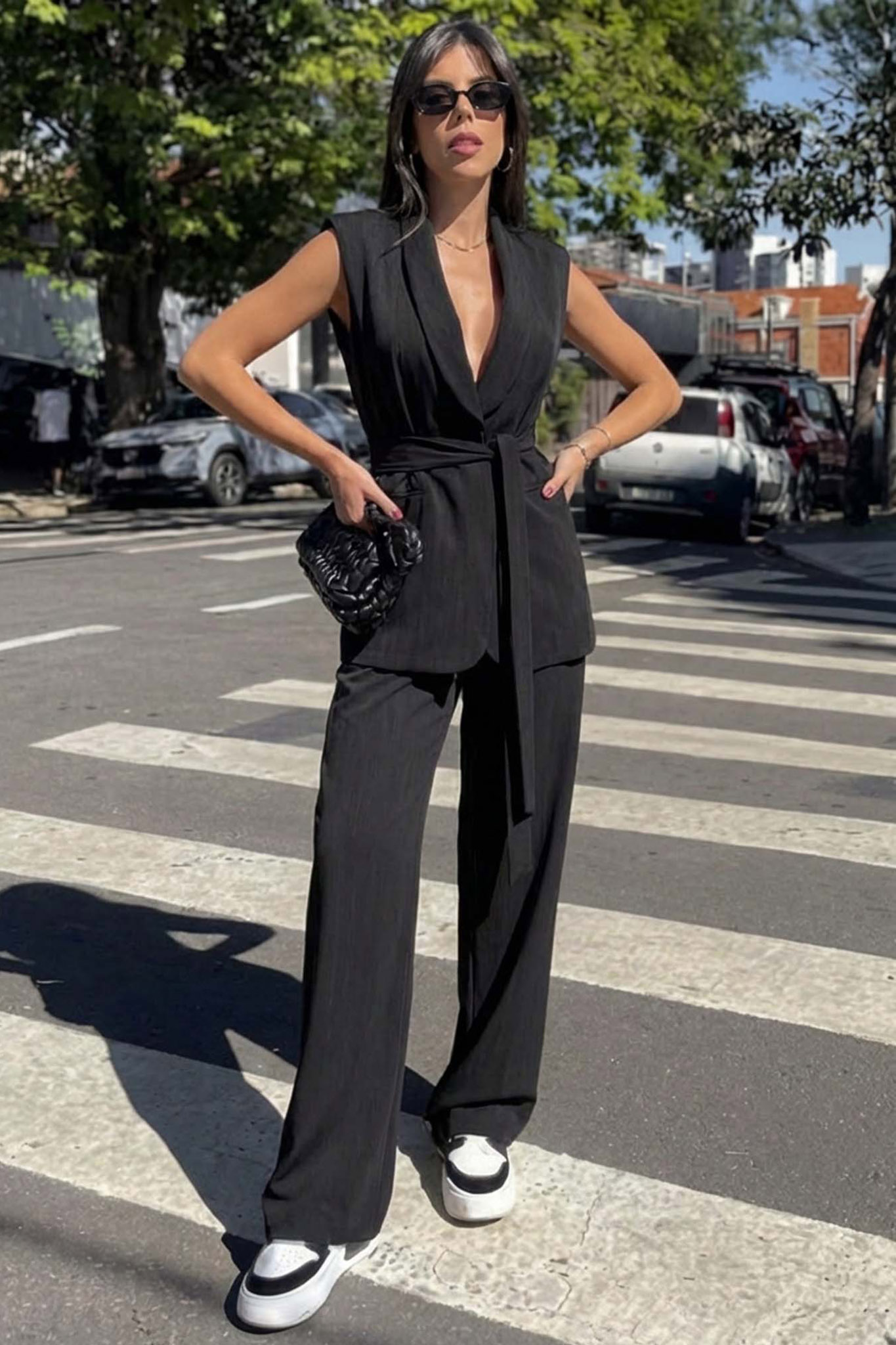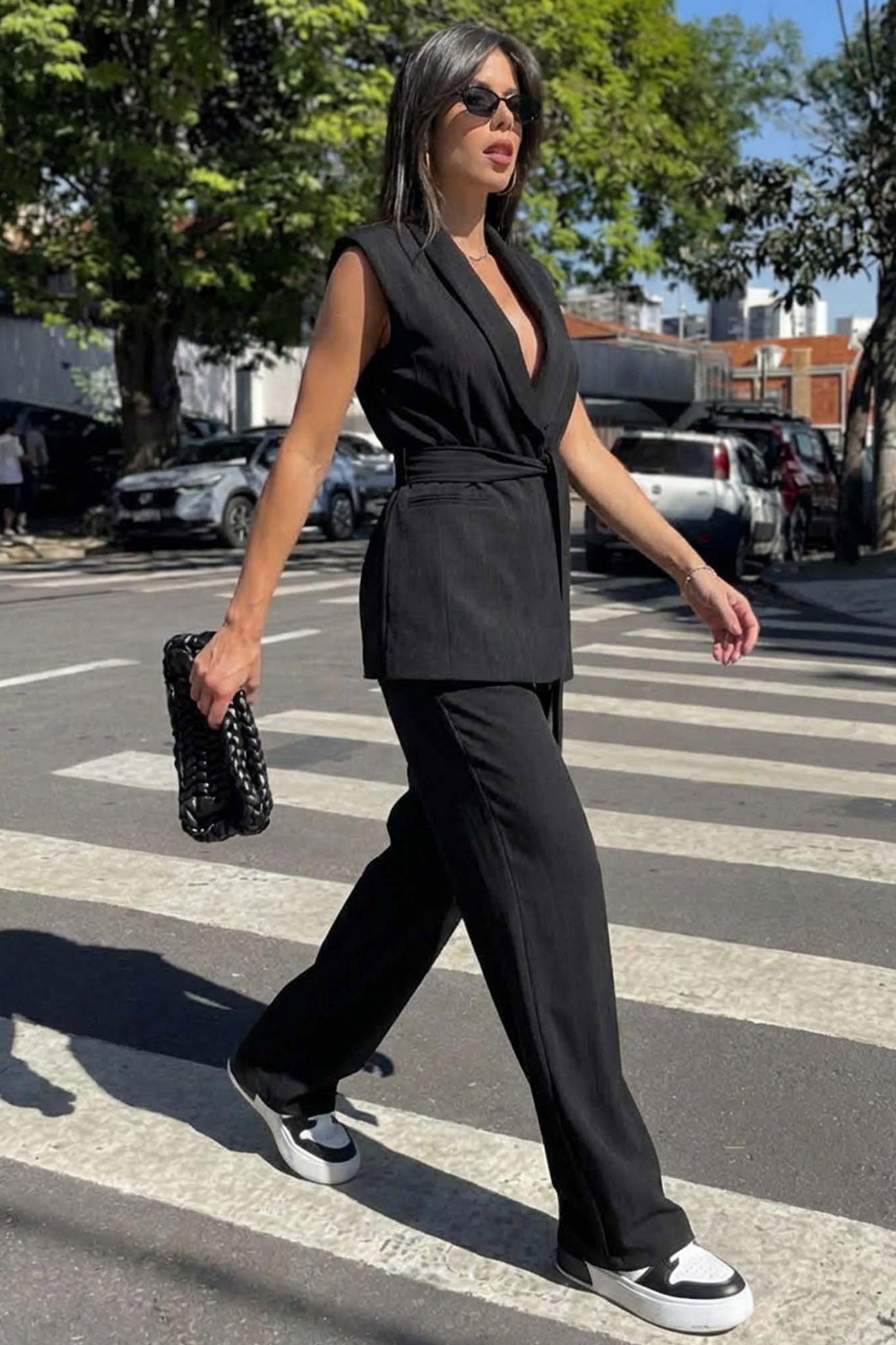 Σετ που αποτελείται από γιλέκο & παντελόνι. Το γιλέκο διαθέτει βάτες και ζώνη στην μέση που αναδεικνύει την σιλουέτα και εφαρμόζει. Προσφέρει ένα κομψό αποτέλεσμα.