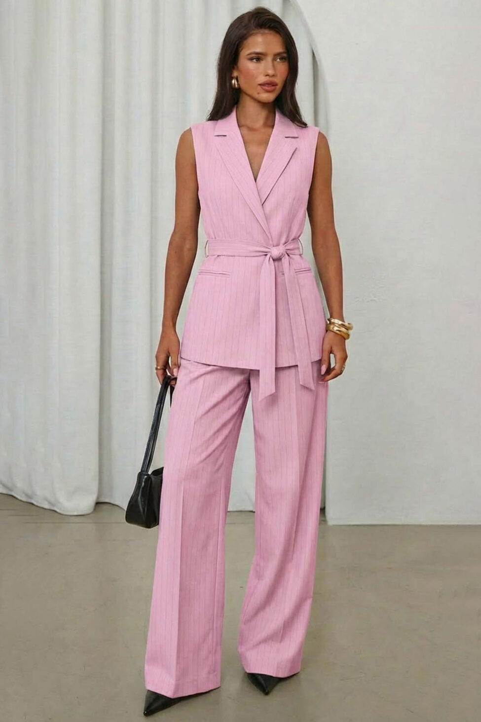 Το σετ αποτελείται από ένα αμάνικο γιλέκο σε στυλ σακακιού με γιακά-πέτο και κλείσιμο με κουμπιά, το οποίο διαθέτει και ζώνη για να τονίζει τη μέση. Το παντελόνι, σε ψηλόμεση και φαρδιά (wide-leg) γραμμή, προσφέρει άνεση και στυλ, ολοκληρώνοντας το σύνολο με φινέτσα. Κατασκευασμένο από ανάλαφρο ύφασμα, είναι η ιδανική επιλογή για αβίαστες, επαγγελματικές ή επίσημες εμφανίσεις.