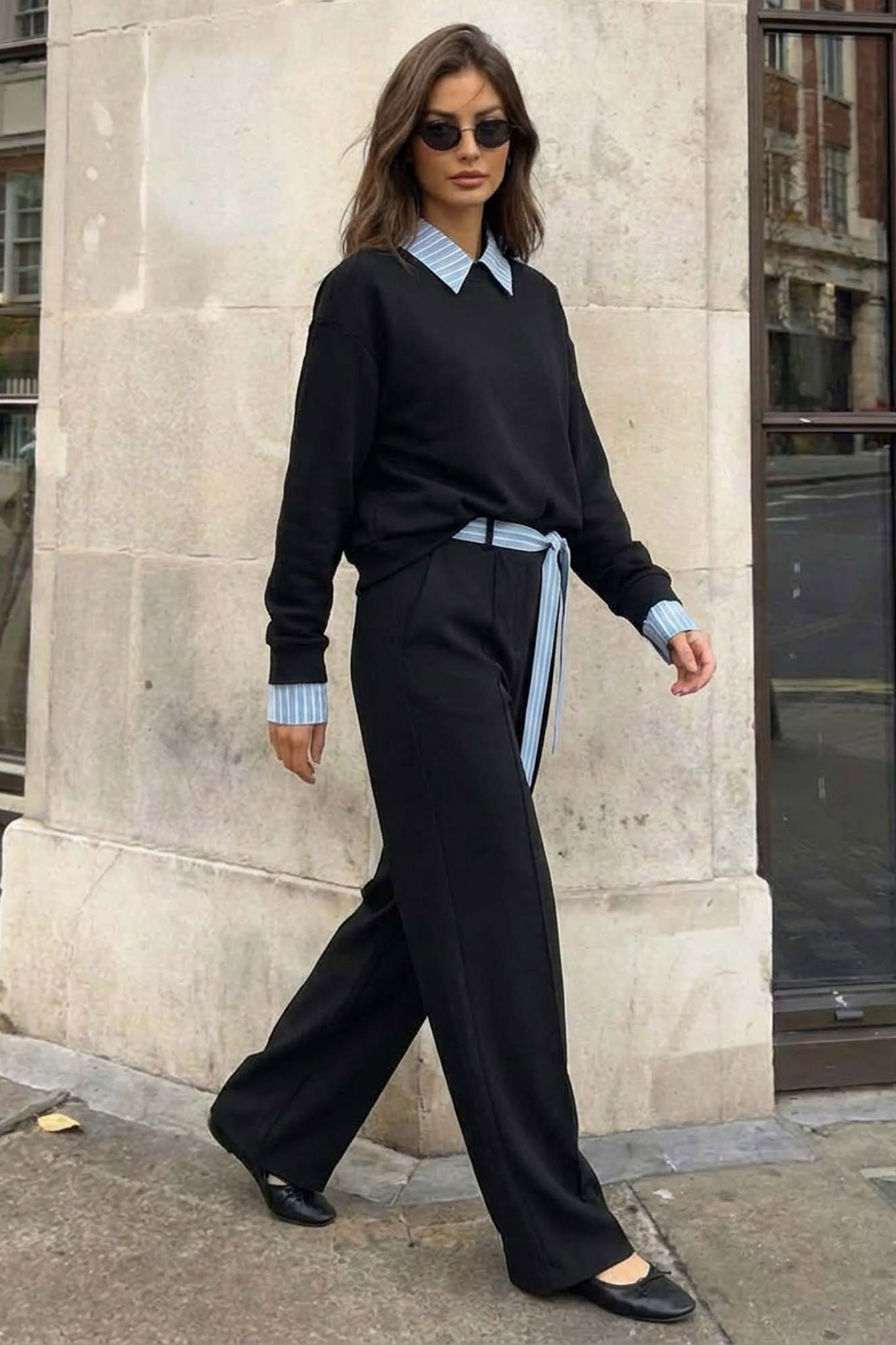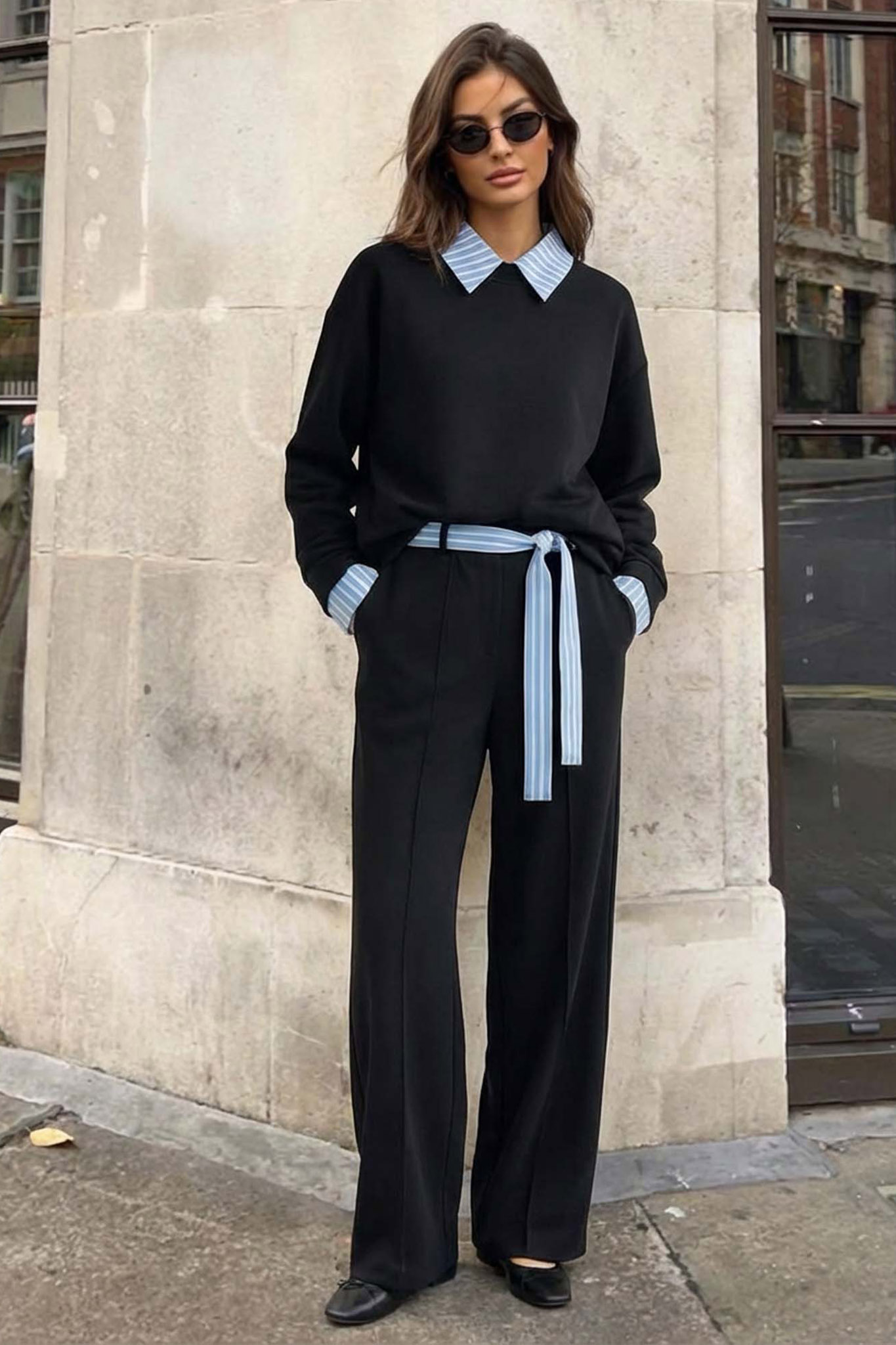 Σετ που αποτελείται από ένα άνετο φούτερ και ένα κομψό παντελόνι με φαρδιά γραμμή. Το σύνολο διαθέτει μια διακριτική, ριγέ ζώνη στη μέση για να τονίζει τη σιλουέτα και να προσθέτει μια πινελιά χρώματος. Κατασκευασμένο από μαλακό και ποιοτικό ύφασμα, είναι η ιδανική επιλογή για αβίαστες, στυλάτες εμφανίσεις από το πρωί ως το βράδυ.