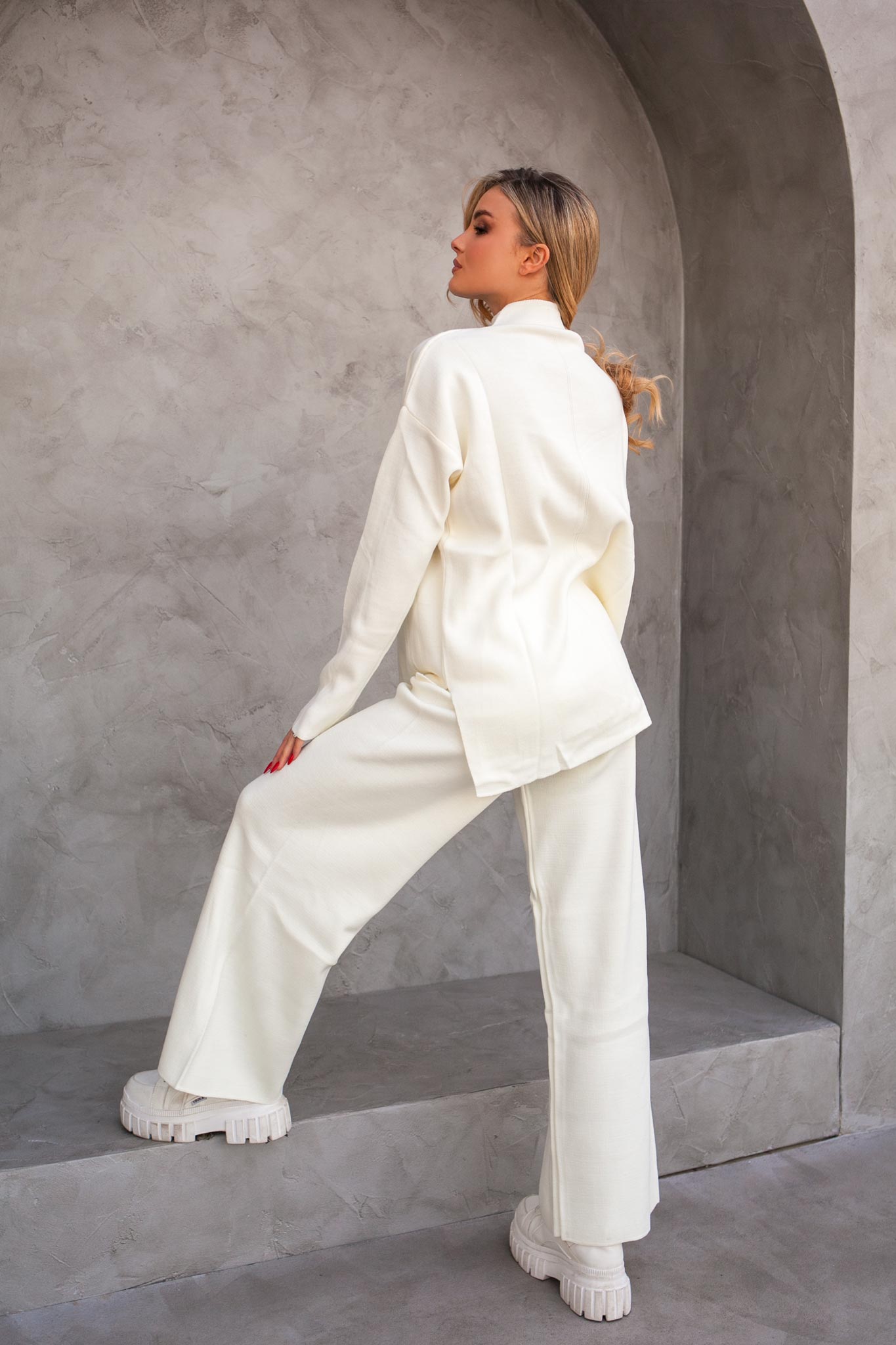 Πλεκτό σετ. Μπλούζα ασύμμετρη με υπερυψωμένη λαιμόκοψη. Παντελόνι ψηλόμεσο με λάστιχο στη μέση. Μπλούζα Μήκος 70cm πίσω- 60cm μπροστά, στήθος 60cm μανίκι 50cm Παντελόνι Μήκος 98cm μέση 33cm